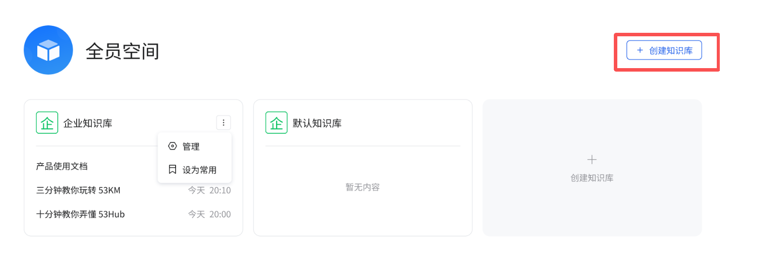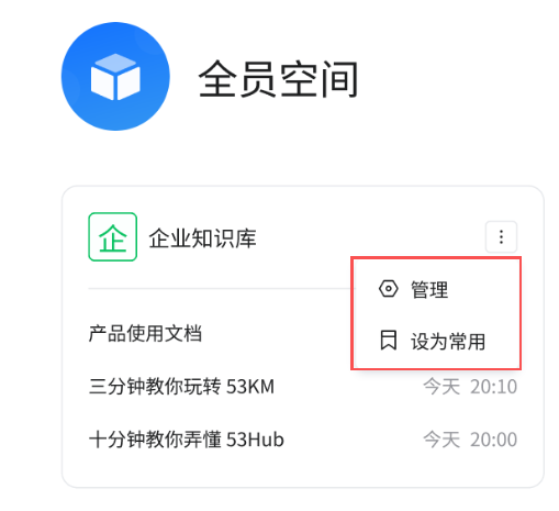 - 1、对于已创建的知识库(如 “企业知识库”),将鼠标悬浮在知识库卡片上,点击右上角的更多操作按钮,可选择 “管理”(对知识库进行编辑、权限设置等管理操作)或 “设为常用”(将该知识库设置为常用,方便快速访问)。