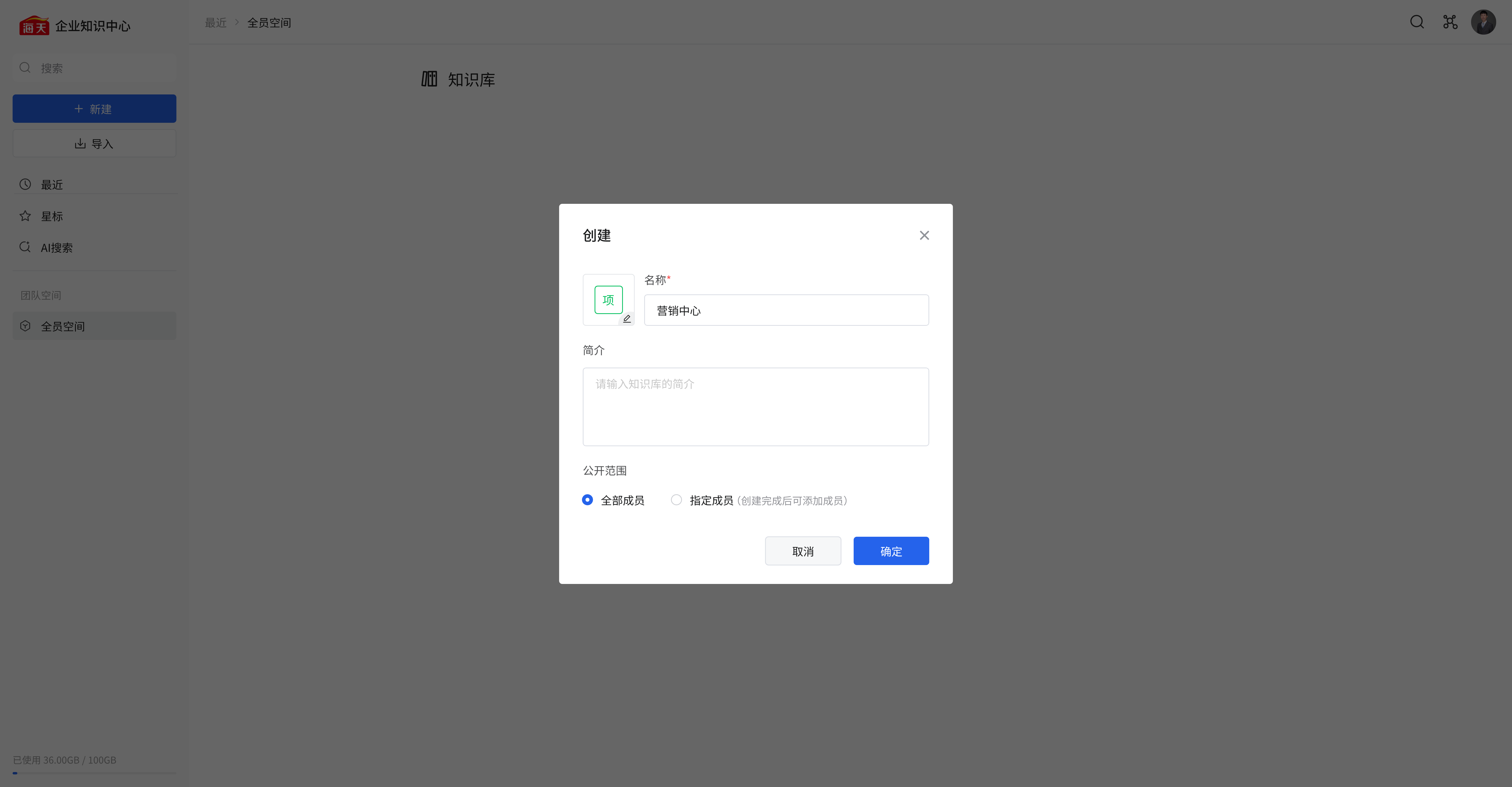 3、“公开范围” 可选择 “全部成员”(所有成员都能访问该知识库)或 “指定成员”(创建完成后可添加指定成员访问),根据需求选择后,点击 “确定” 按钮,即可成功创建知识库。