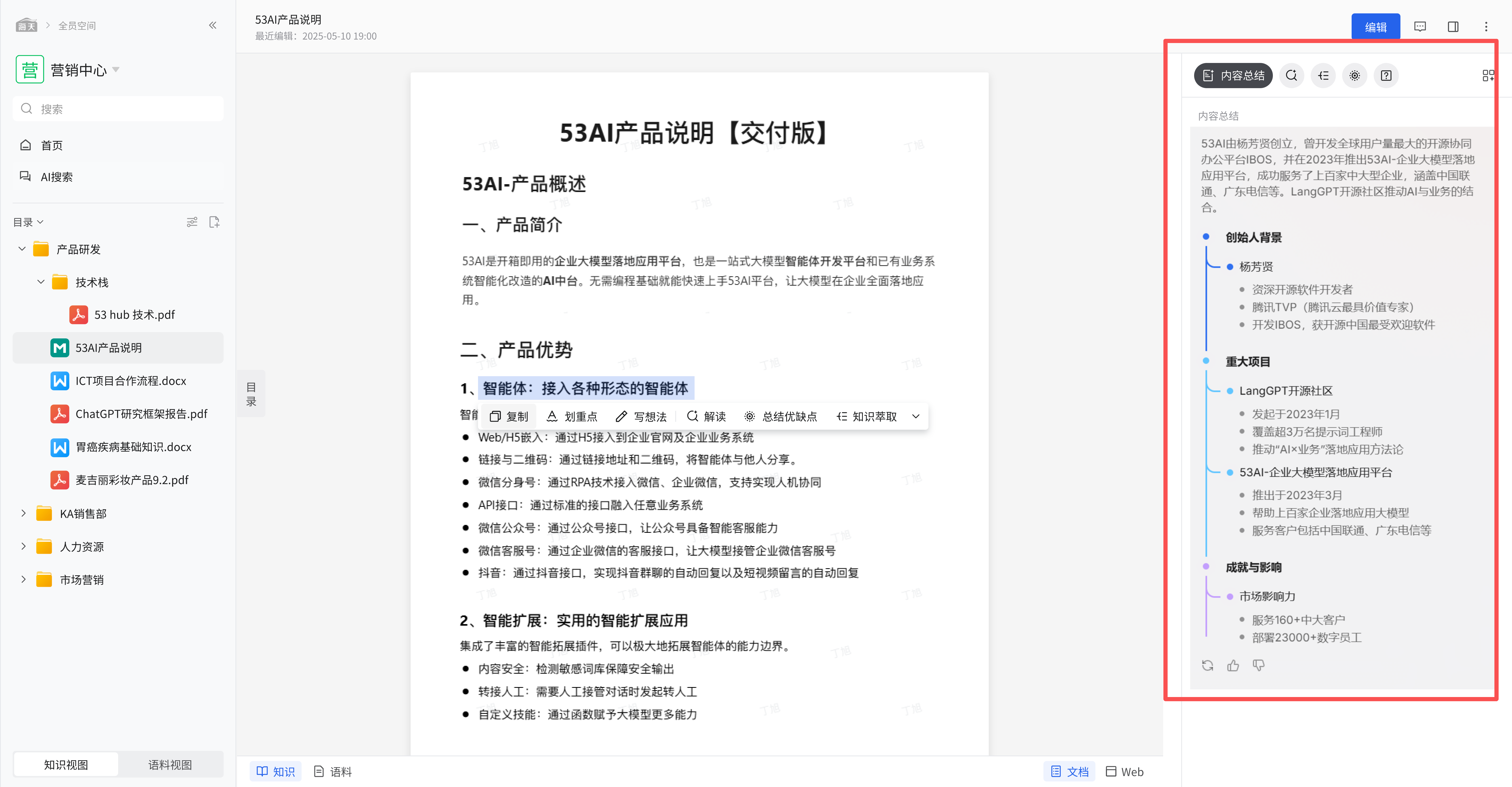 当用户在文档(如 “53AI 产品说明【交付版】”)中选中任意文本(例如选中 “智能体:接入各种形态的智能体” 这段文字)时,会立即弹出划词操作菜单,方便用户快速进行后续交互。 image.png