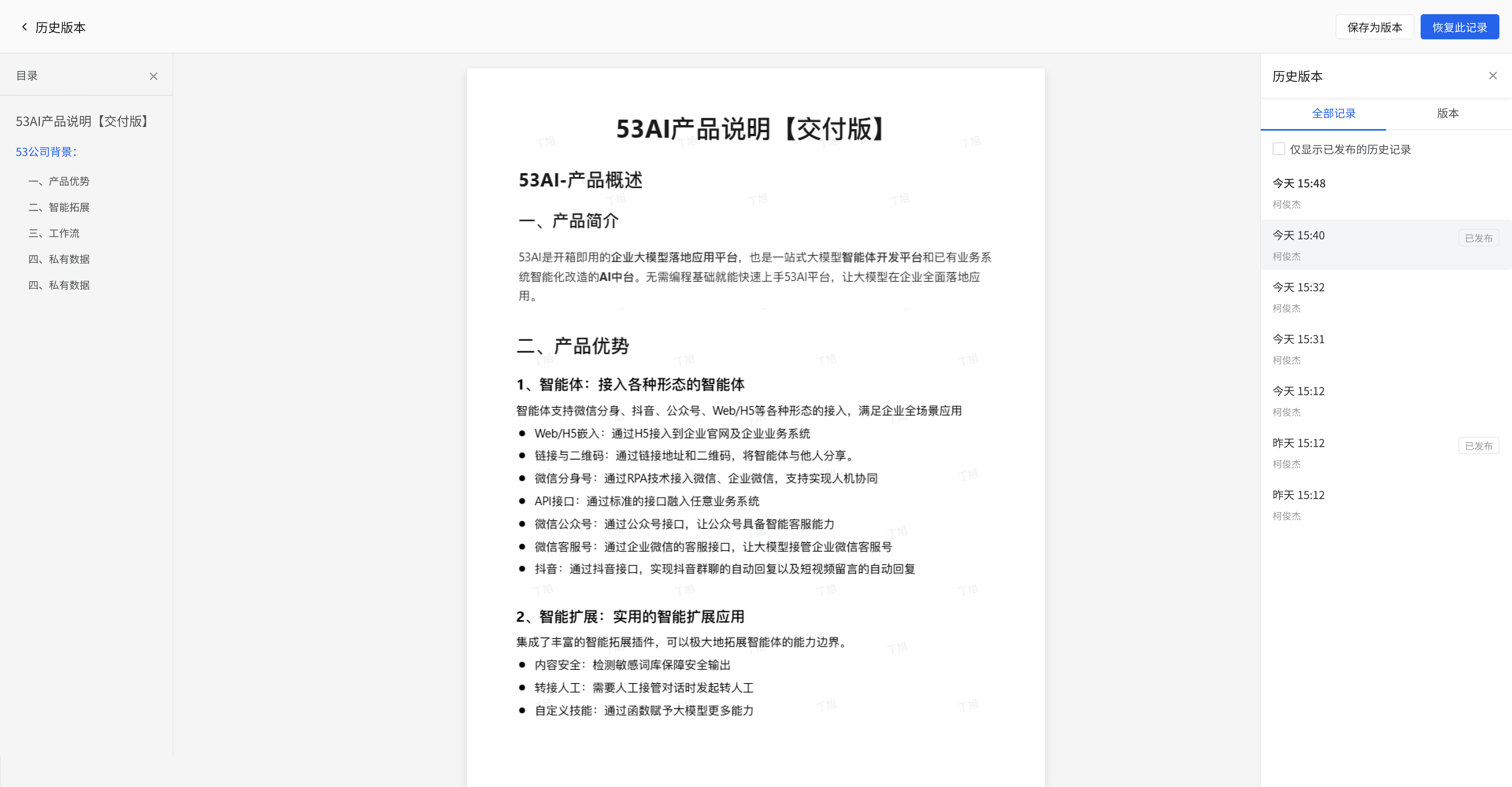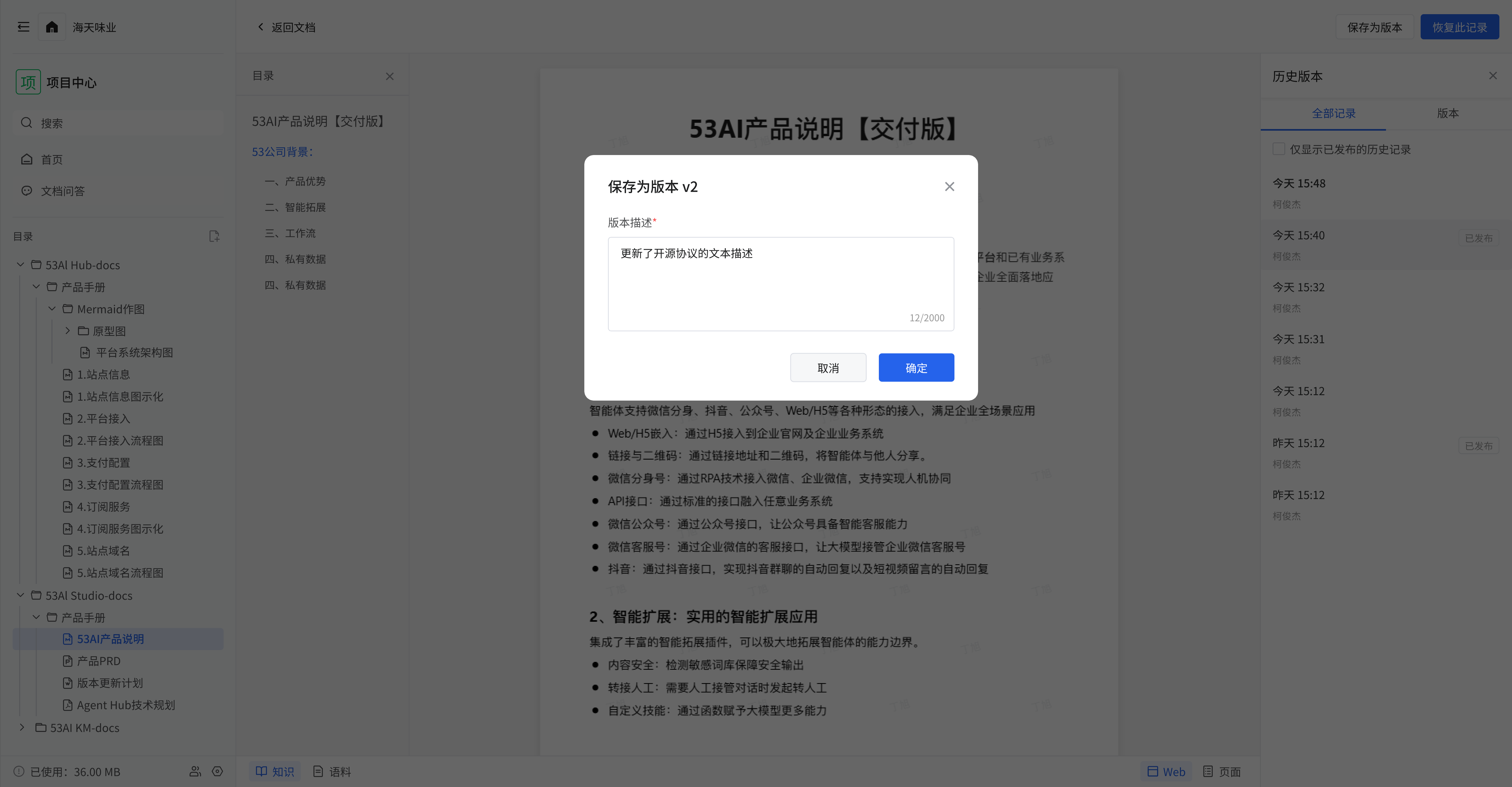 • 查看历史版本: 在历史版本管理方面,点击 “查看历史版本”,会展示含不同时间点、操作人且部分标注 “已发布” 的文档历史版本记录列表,清晰呈现变更历史;若要恢复某一历史版本,点击该版本对应的 “恢复此记录” 按钮,文档内容就会回退到该版本状态,便于在文档变更出问题时回溯修正;点击 “保存为版本”,在弹出的弹窗 “版本描述” 输入框中输入信息(如 “更新了开源协议的文本描述”)后点击 “确定”,可将当前文档状态保存为新的版本,方便后续追溯变更内容与原因。 64177c9cc805d01fec4ac8471f845788.png 95839ef4ec503d1e63caa0a446b565e5.png