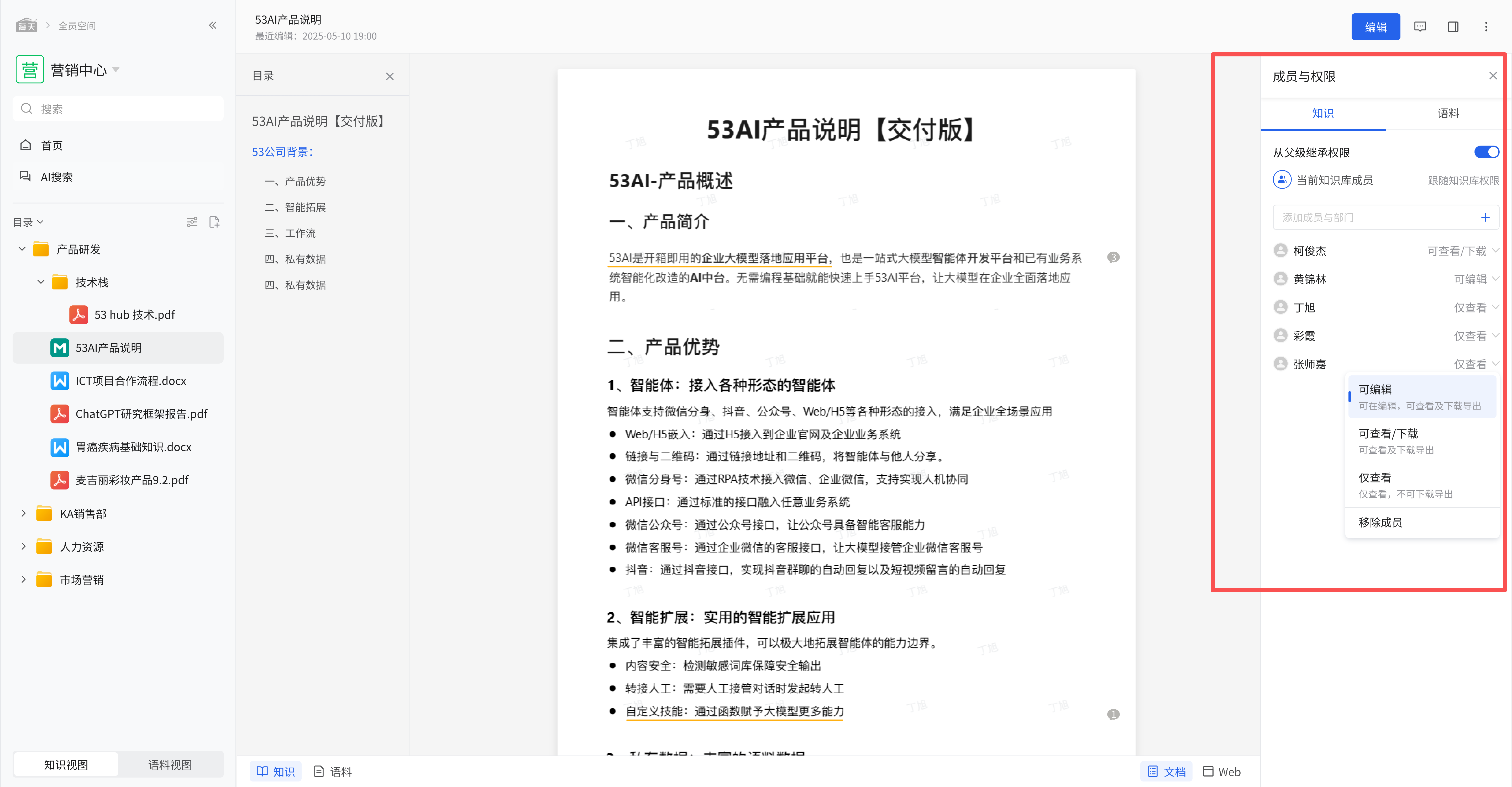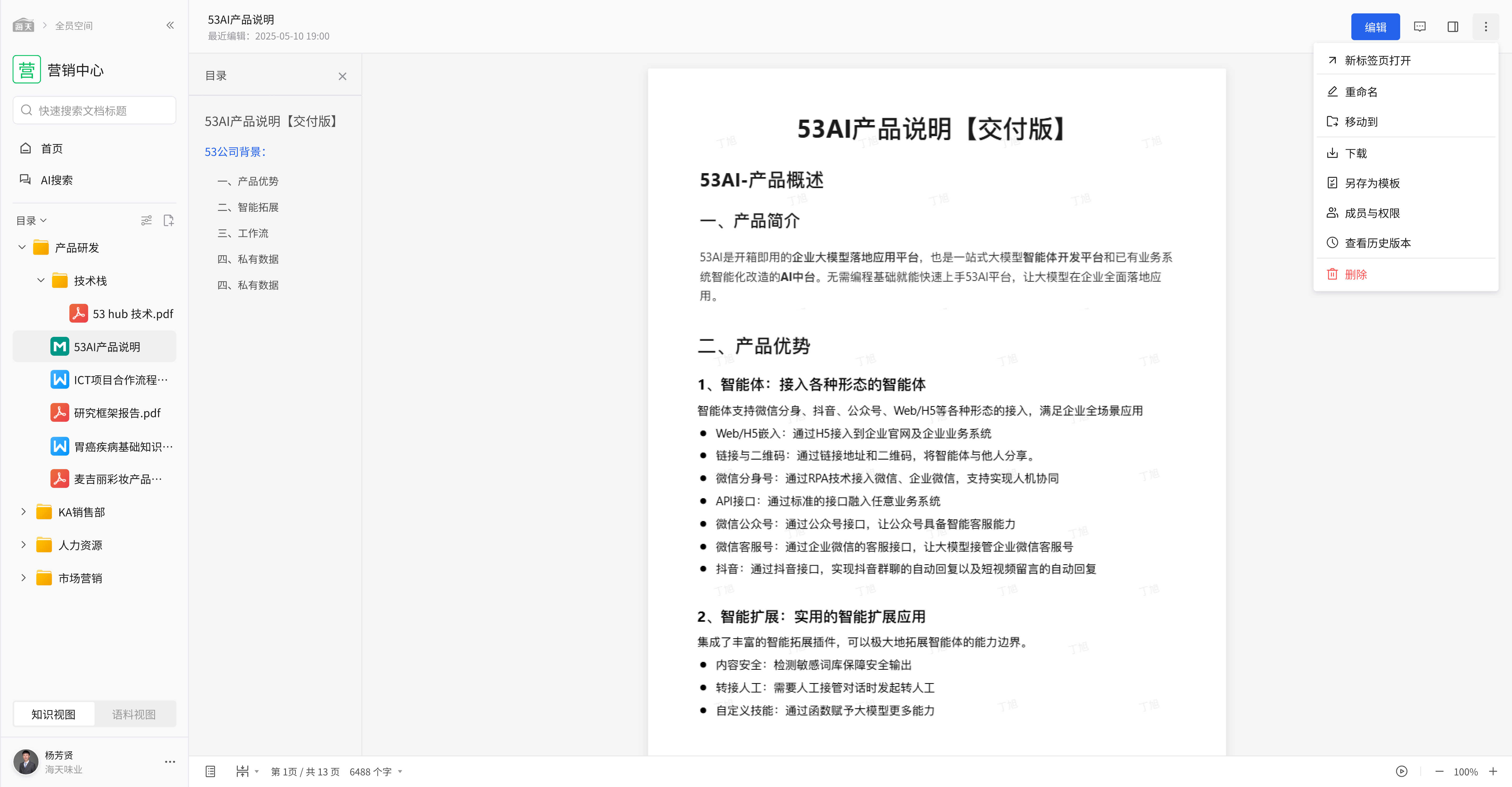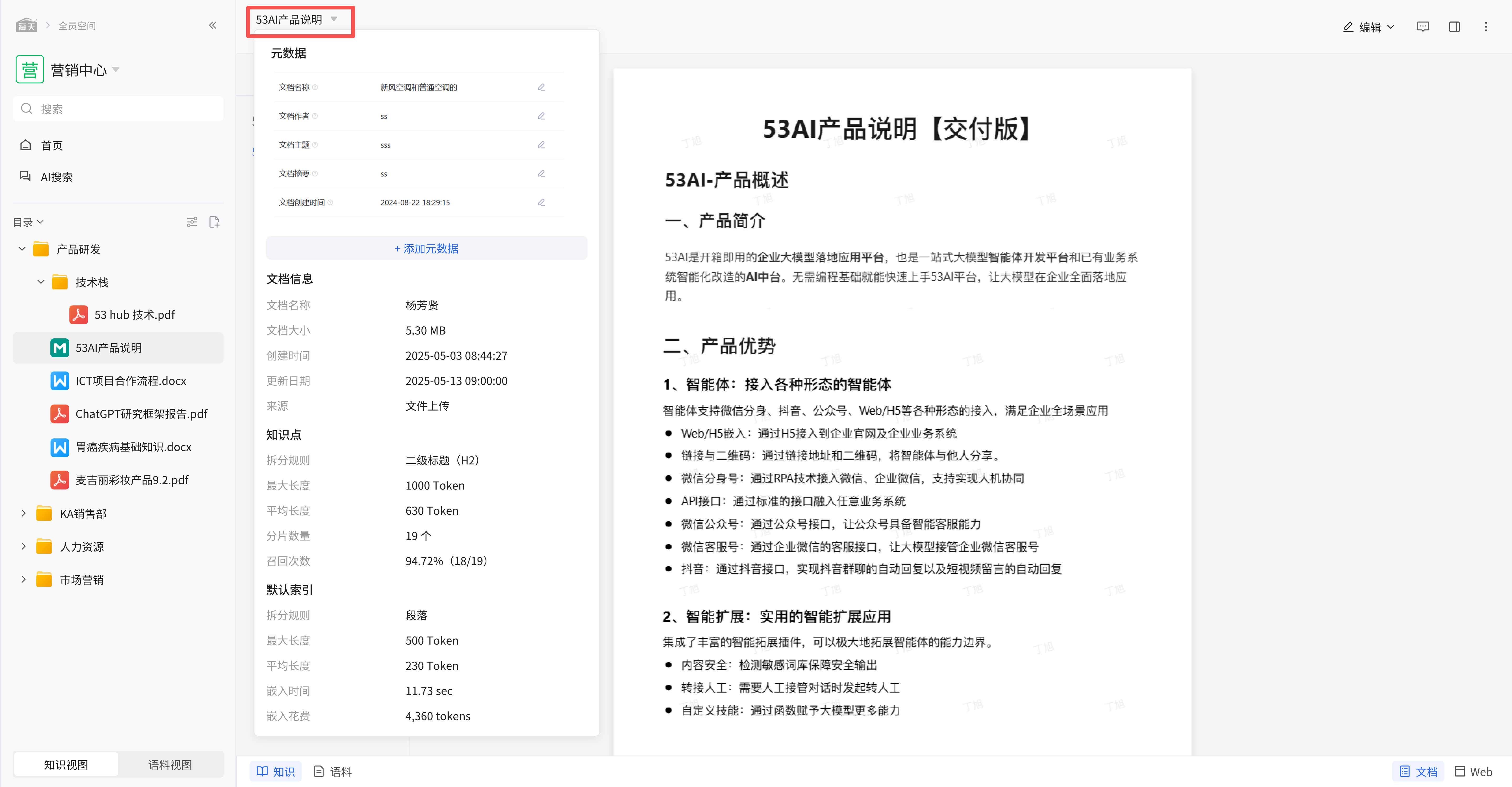 在知识视图下,可查看如 “53AI 产品说明【交付版】” 等文档内容,满足多样化的文档操作需求。