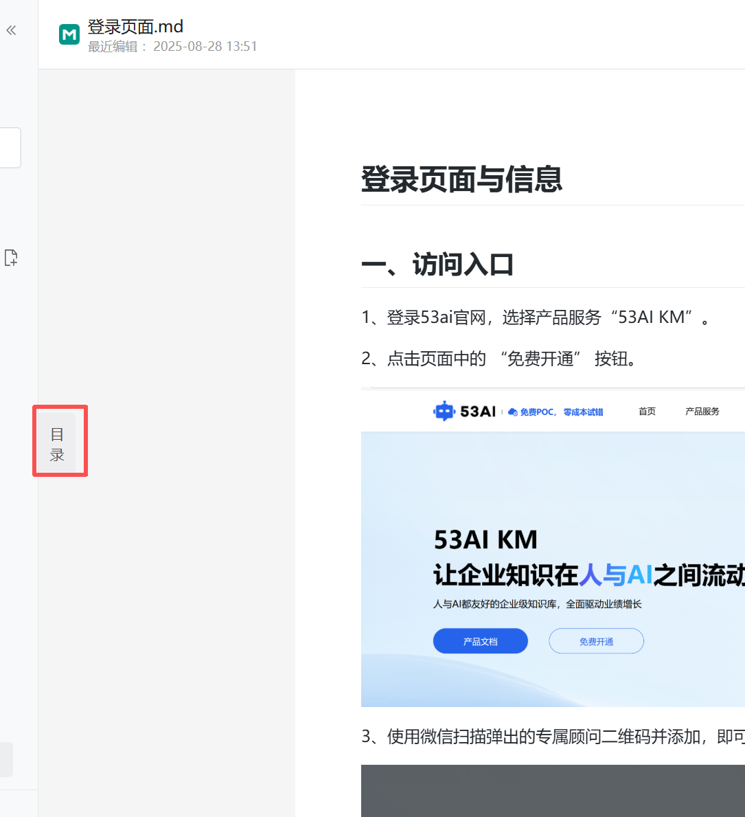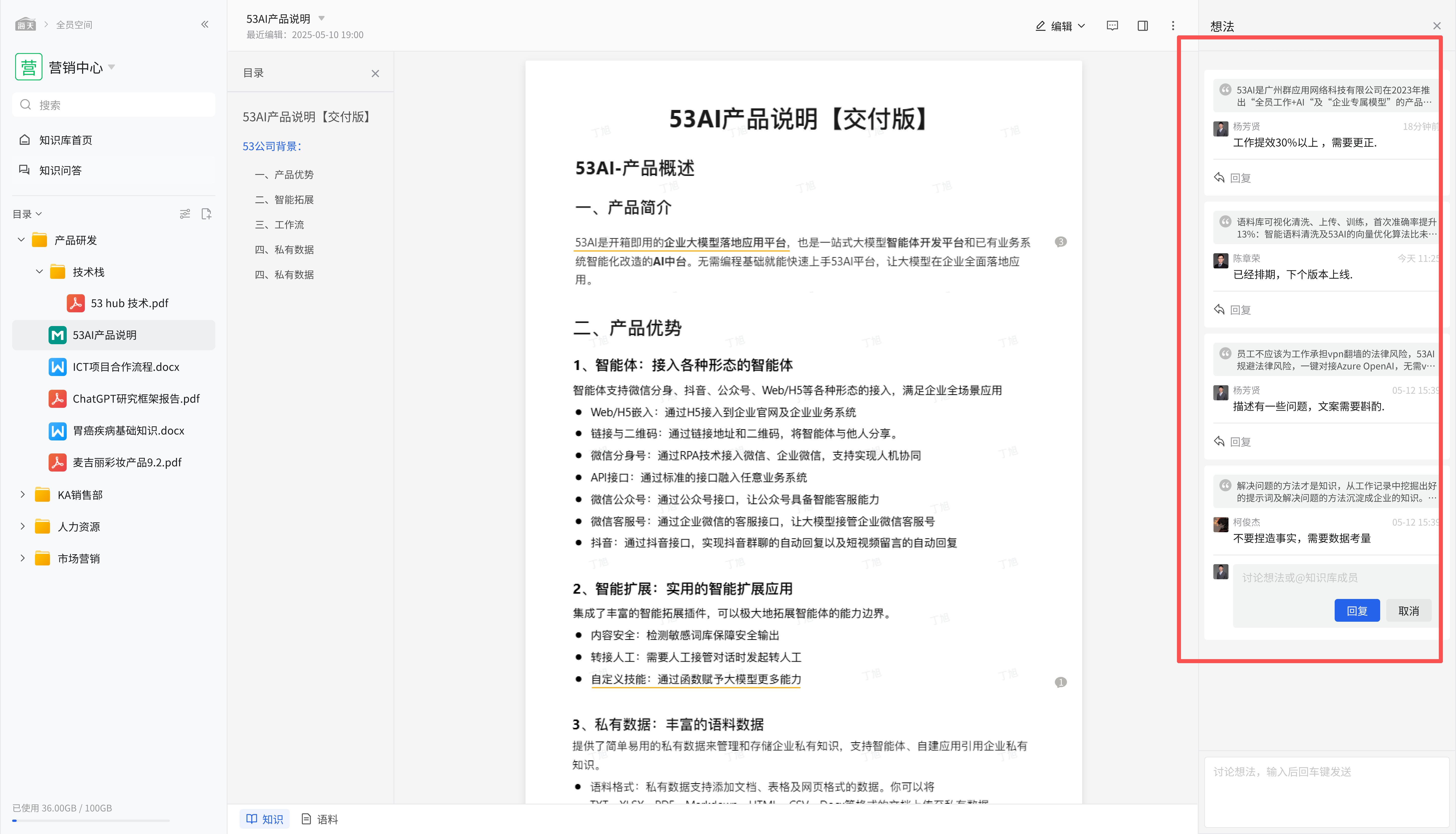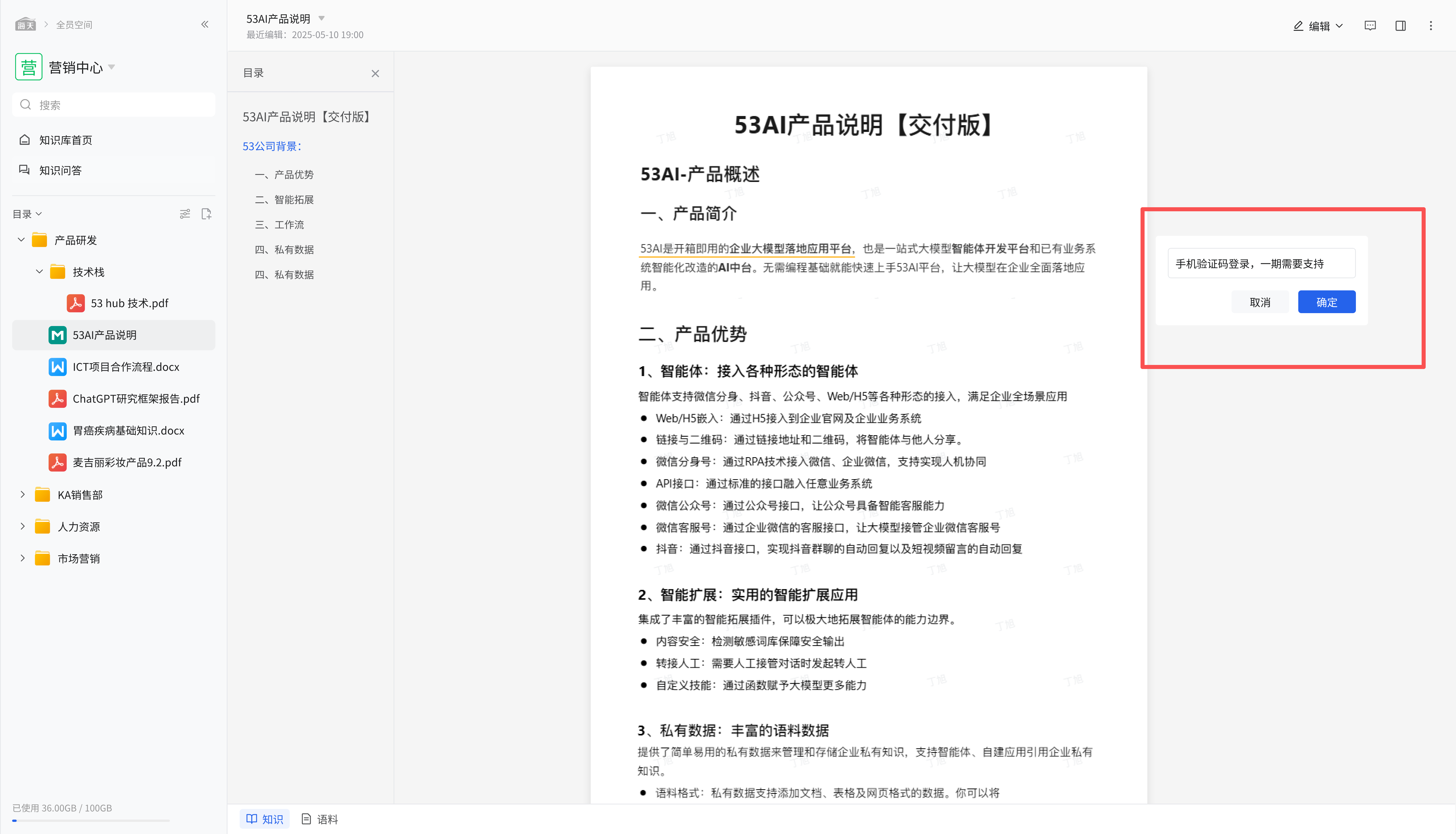 在知识视图下,可查看如 “53AI 产品说明【交付版】” 等文档内容,满足多样化的文档操作需求。