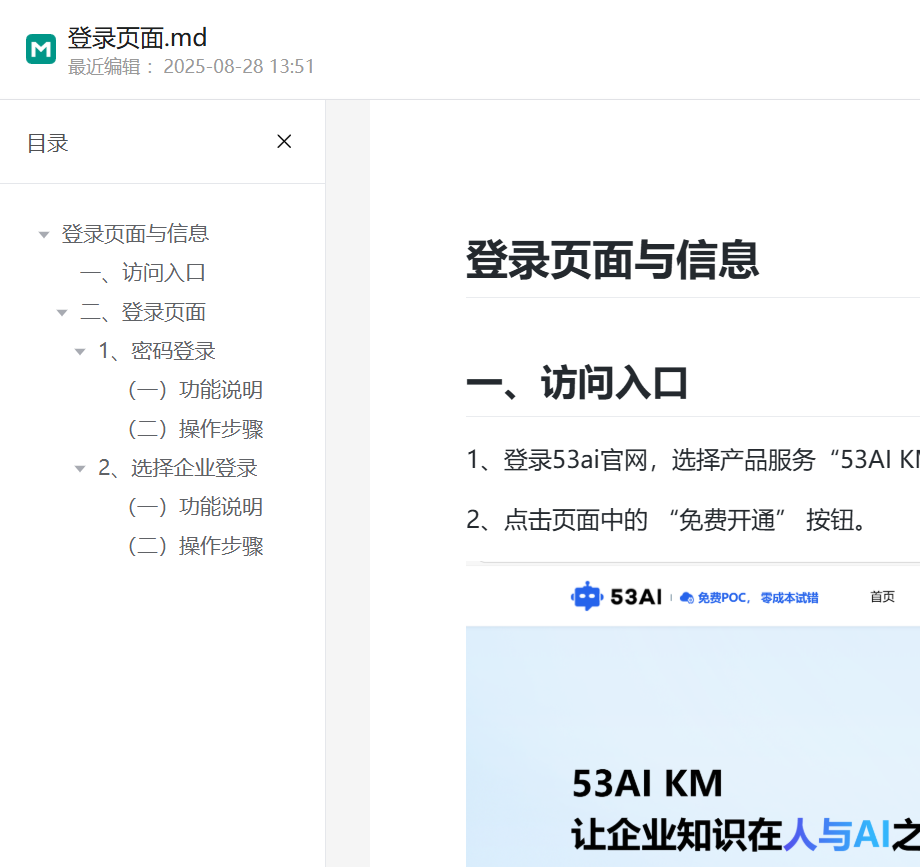 点击右上角醒目的 “编辑” 按钮,即可进入文档编辑模式。在此模式下,能够对文档的各类内容进行修改,从而及时更新文档内容,保证信息的准确性与时效性。具体编辑功能可查看文档“MD编辑使用指南” image.png