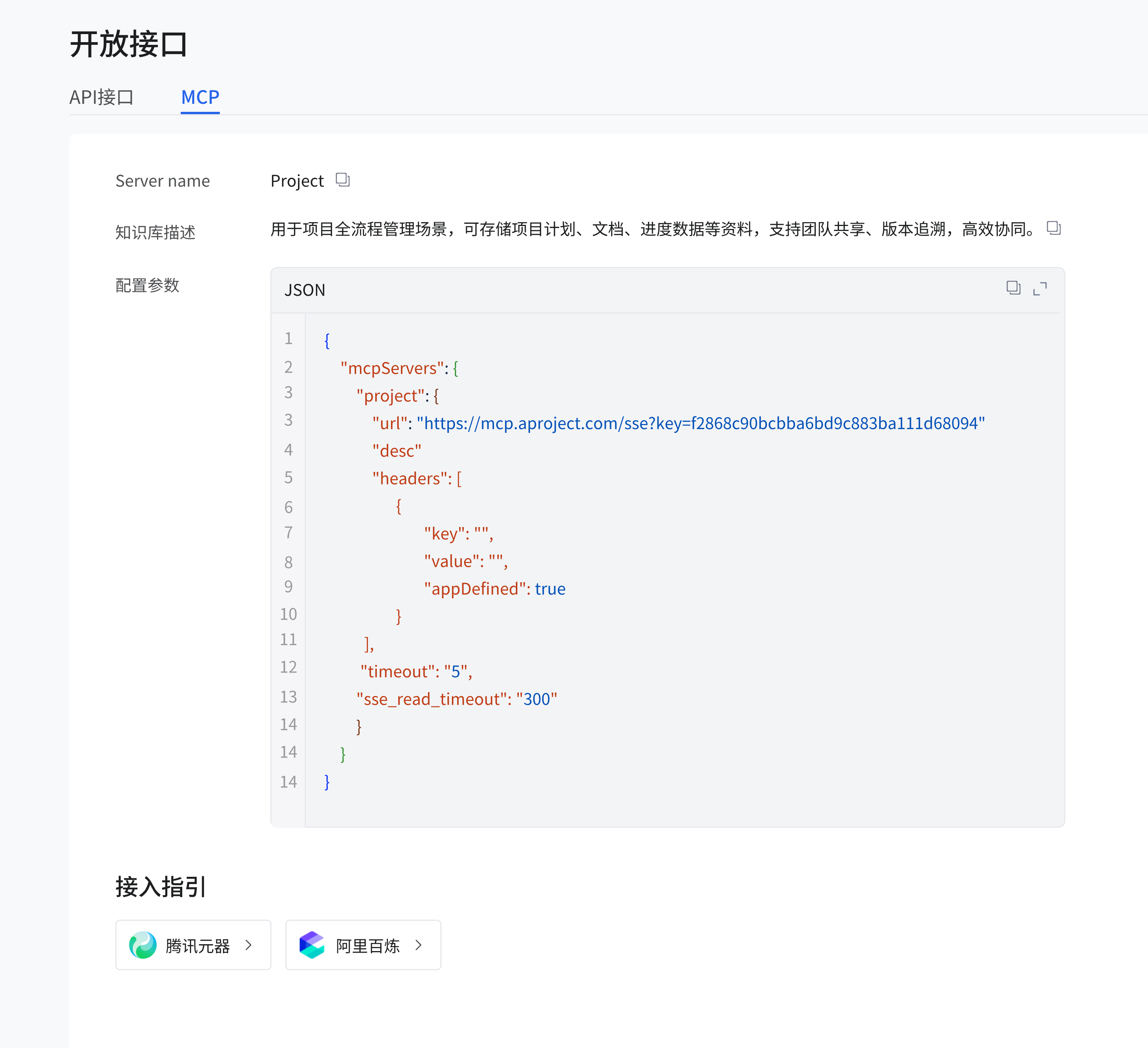 切换到 “MCP” 标签页,可查看 Server name(如 “Project”)、知识库描述(用于项目全流程管理等说明),在 “配置参数” 区域,可查看或编辑 JSON 格式的配置内容,如 “mcpServers”“project” 相关的 url、headers、timeout 等参数。在 “接入指引” 区域,点击 “腾讯元器” 或 “阿里百炼”,可查看对应的接入流程,按指引完成接入。 image.png
