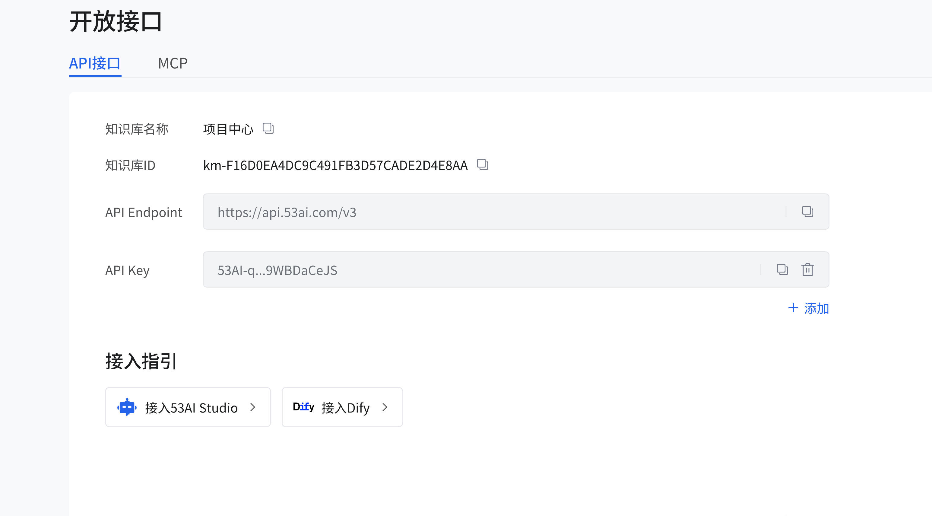 进入 “开放接口” 的 “API 接口” 页面,可查看知识库名称(如 “项目中心”)、知识库 ID、API Endpoint(如 “https://api.53ai.com/v3”)、API Key 等信息。点击 “+ 添加” 可添加新的 API 相关配置,在 “接入指引” 区域,点击 “接入 53AI Studio” 或 “接入 Dify”,可查看对应的接入步骤说明,按步骤完成与外部平台的 API 对接。 image.png