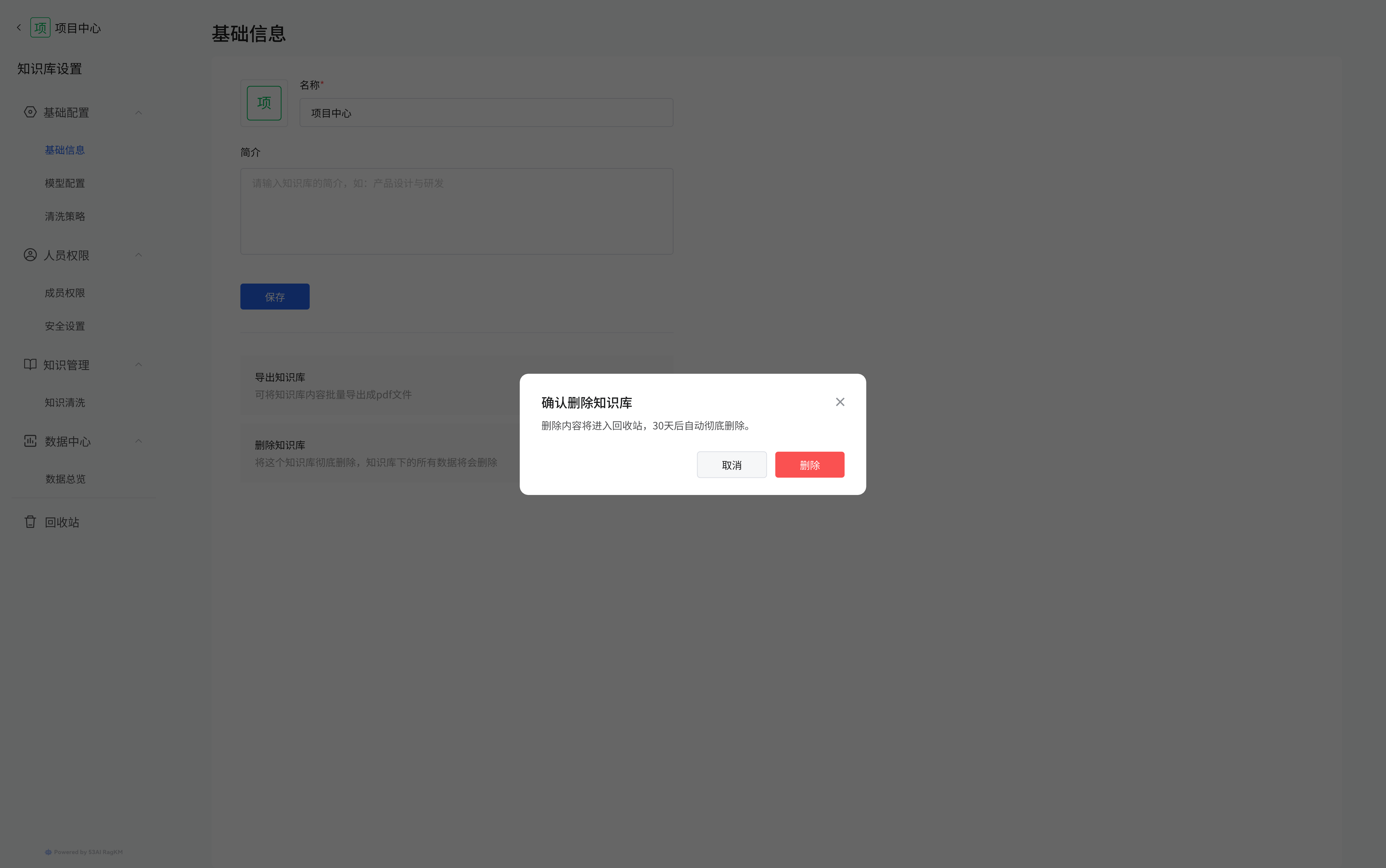 点击 “删除知识库” 区域的 “删除” 按钮,会弹出 “确认删除知识库” 提示框,提示删除内容将进入回收站,30 天后自动彻底删除。若确认删除,点击 “删除” 按钮;若取消,点击 “取消” 按钮。 6aa19ff5688acb5b4cc9ce40c37431dc.png