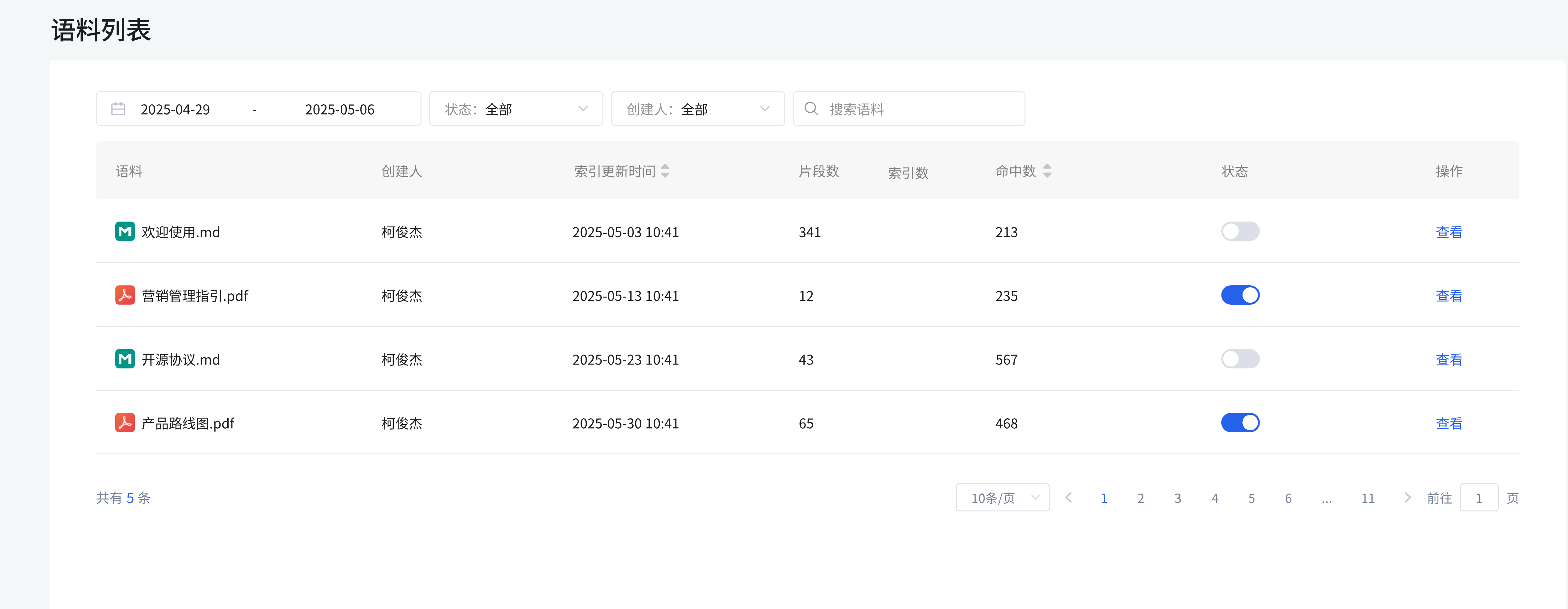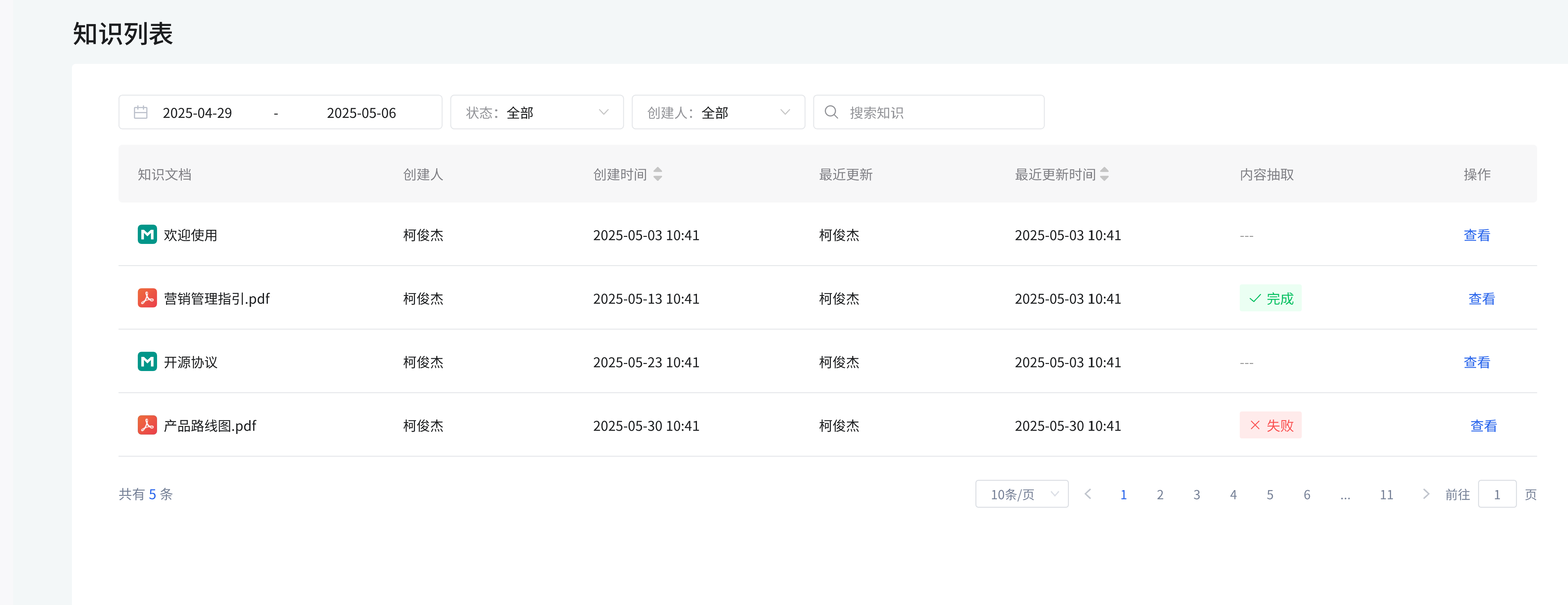 列表展示知识文档的名称、创建人、创建时间、最近更新人、最近更新时间、内容抽取状态(完成、失败等),点击 “查看” 可查看文档详情,还可进行分页(如 10 条 / 页)浏览等操作。 image.png
