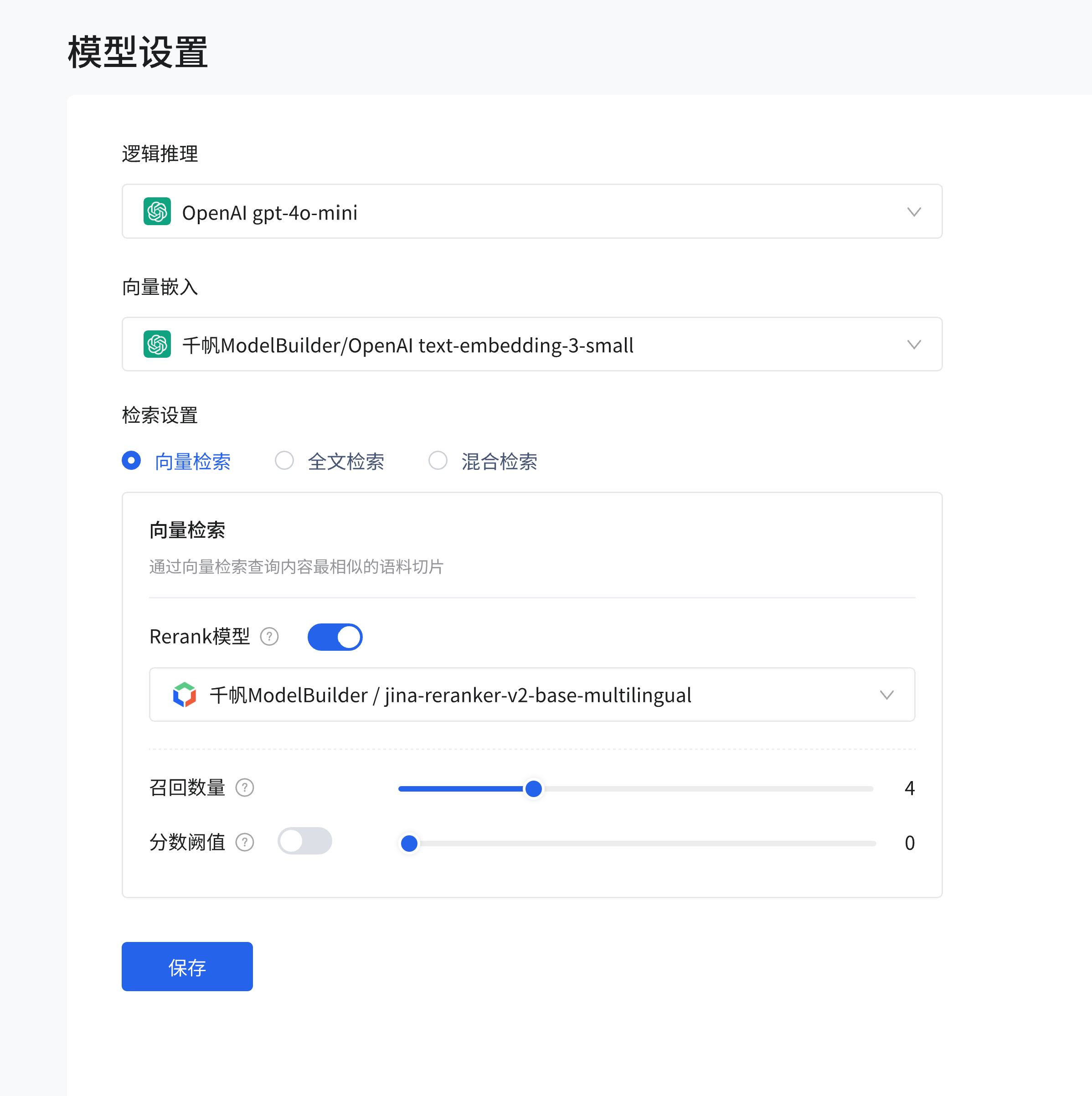 选择检索方式,如 “向量检索”“全文检索”“混合检索”。以 “向量检索” 为例,可开启 Rerank 模型(如千模 ModelBuilder /jina-reranker-v2-base-multilingual),设置召回数量(通过滑块调整,如 4)和分数阈值(开启后通过滑块调整),点击 “保存” 按钮保存设置。 image.png