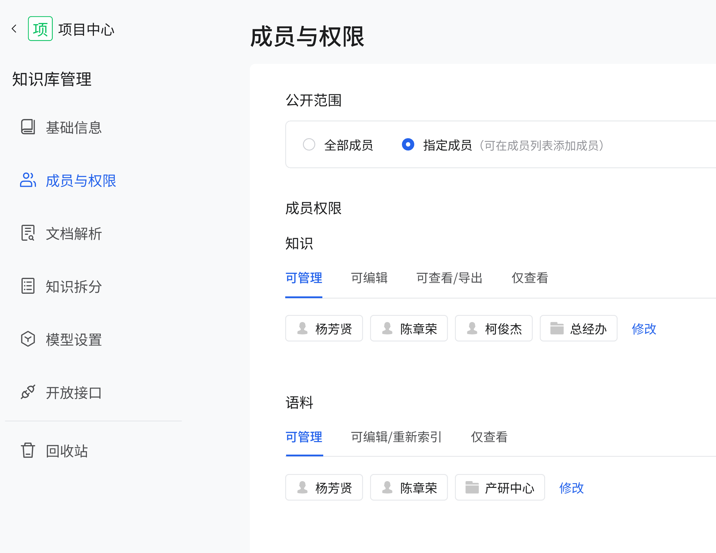 在 “成员与权限” 页面,可设置知识库的公开范围,选择 “全部成员” 则所有成员可见;选择 “指定成员”,可在成员列表添加成员,限制只有指定成员能访问。