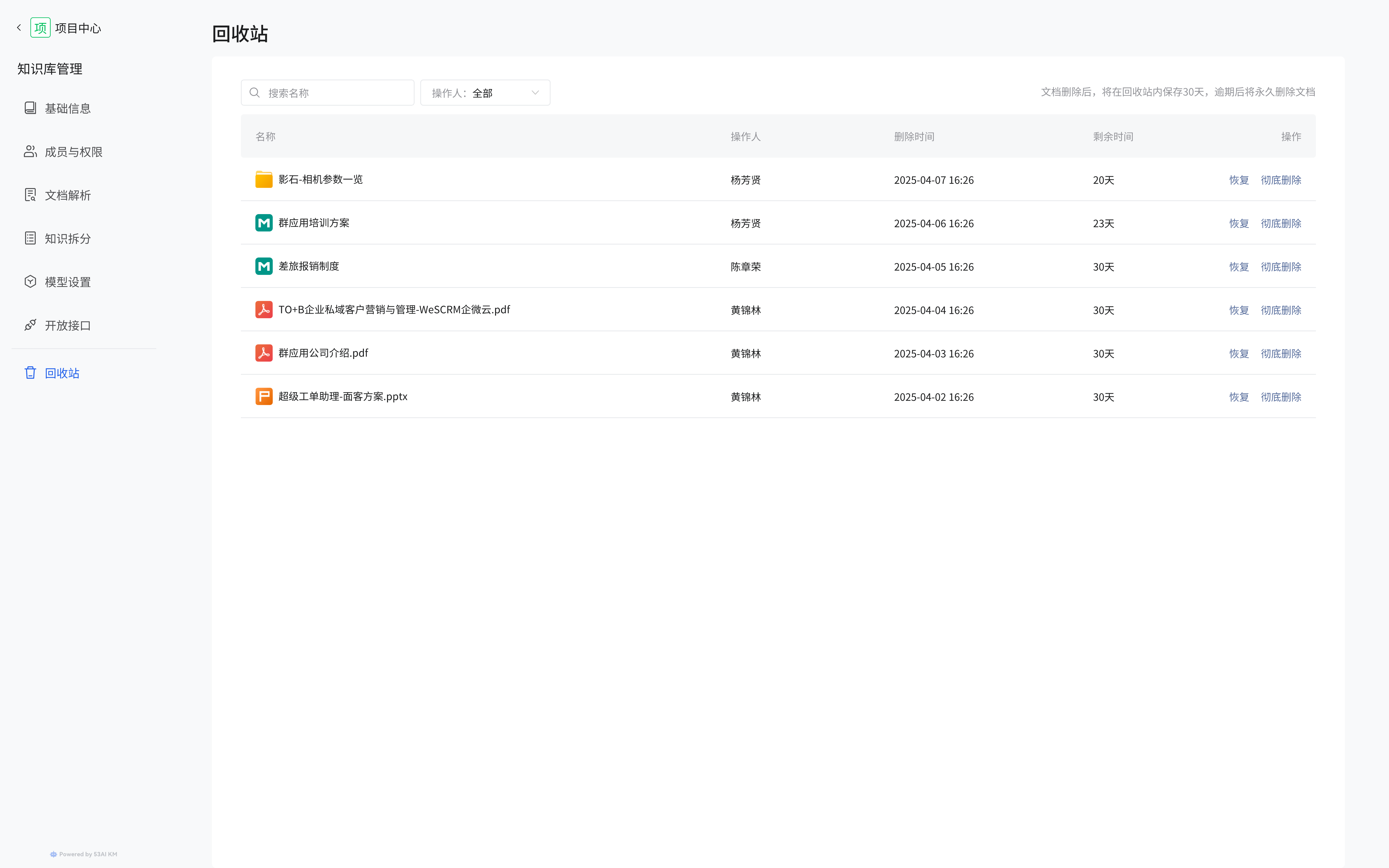 在 “回收站” 页面,可查看被删除的文档列表,包括文档名称、操作人、删除时间、剩余时间等信息。可通过搜索框按名称搜索,或按操作人筛选。 d4cf4f054eca50d2903b7c50529b4466.png