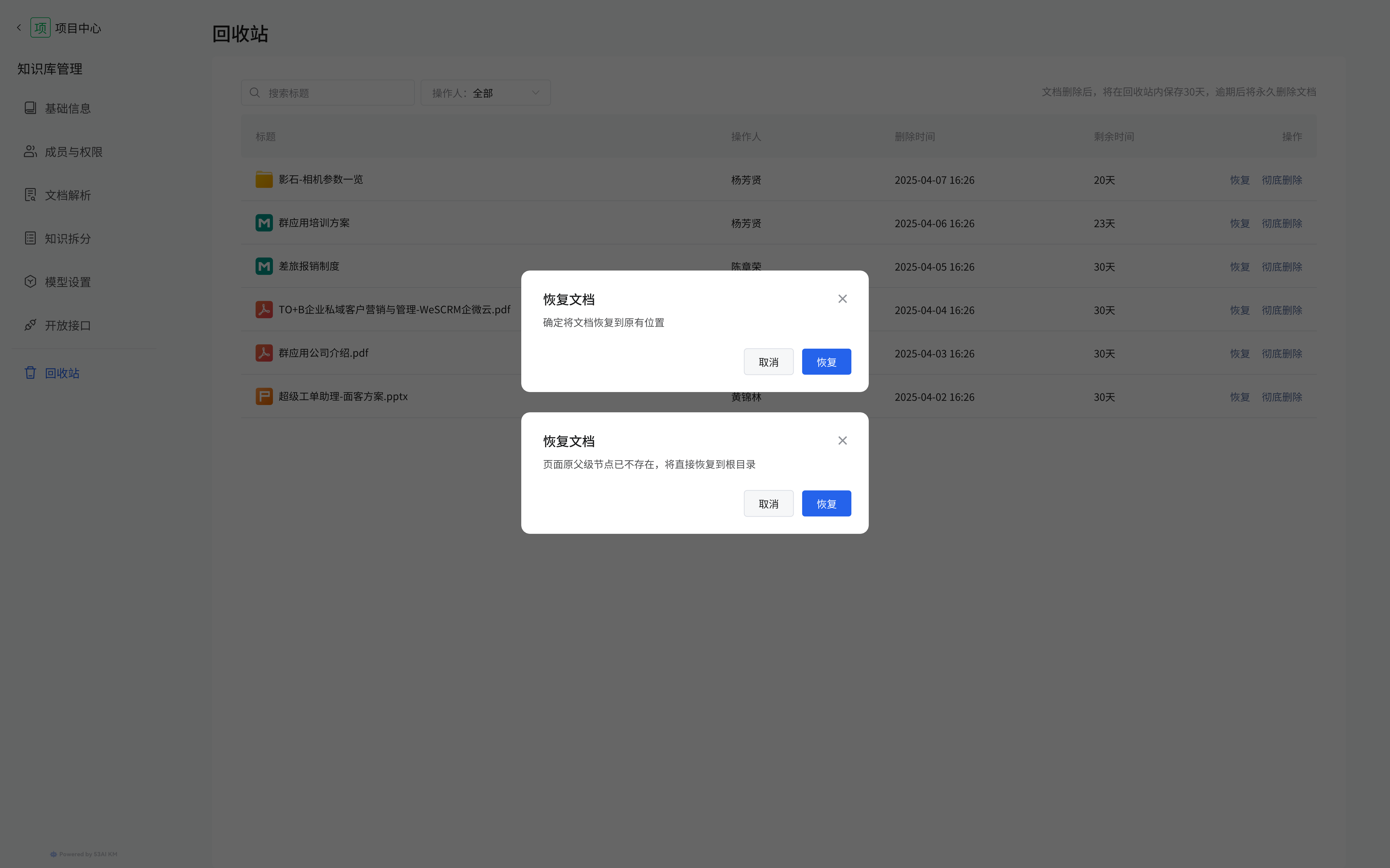 对于回收站中的文档,点击 “恢复” 按钮: 1、若原父级节点存在,会弹出 “确定将文档恢复到原有位置” 提示框,点击 “恢复” 即可恢复; 2、若原父级节点不存在,会提示 “页面原父级节点已不存在,将直接恢复到根目录”,点击 “恢复” 恢复文档。 3、点击 “彻底删除” 按钮,可直接永久删除文档。 ea31756077e1dc8b68e8fc5006e4bba2.png
