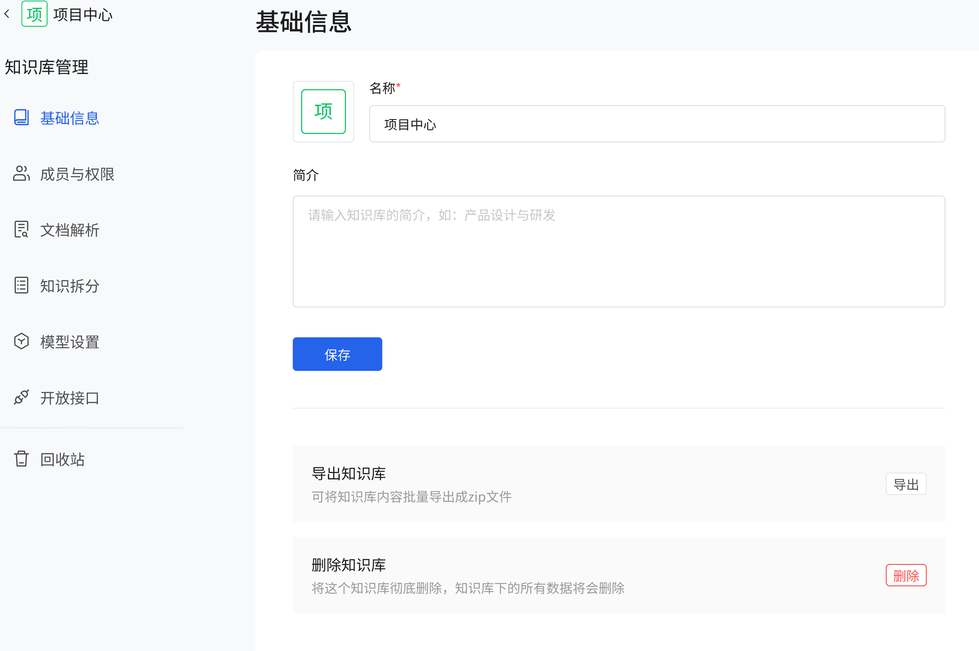 进入知识库(如 “项目中心” 知识库)的 “基础信息” 页面,可设置知识库名称(如 “项目中心”),在 “简介” 输入框中输入知识库的简介(如产品设计与研发相关介绍),点击 “保存” 按钮完成基础信息保存。