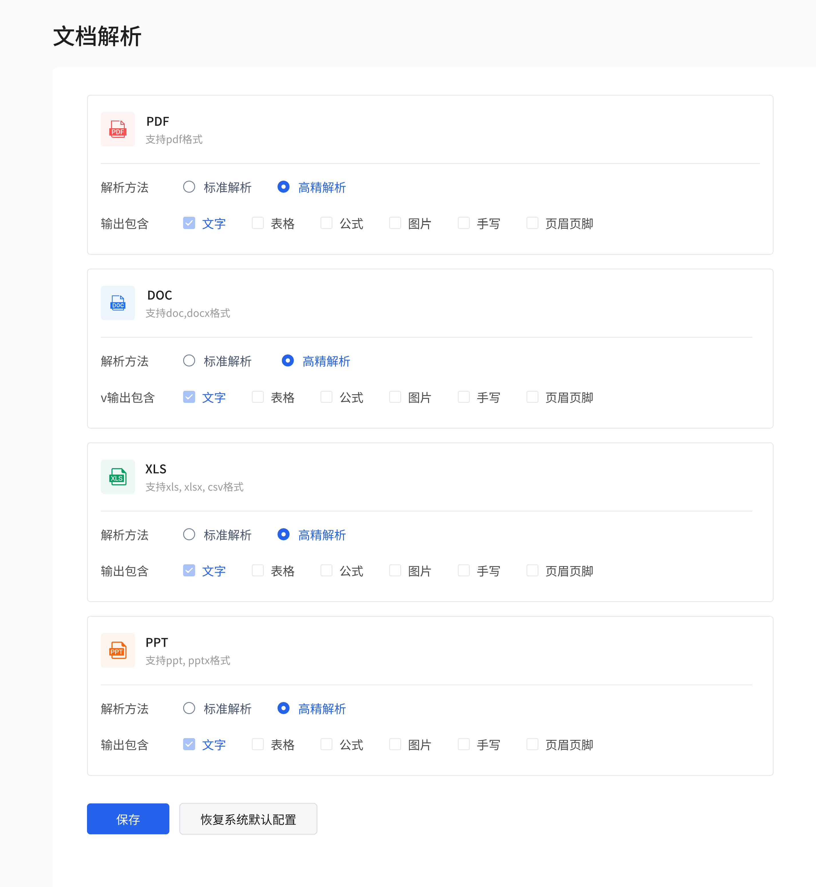 在 “文档解析” 页面,可对不同格式文档(PDF、DOC、XLS、PPT)的解析方法和输出内容进行设置。