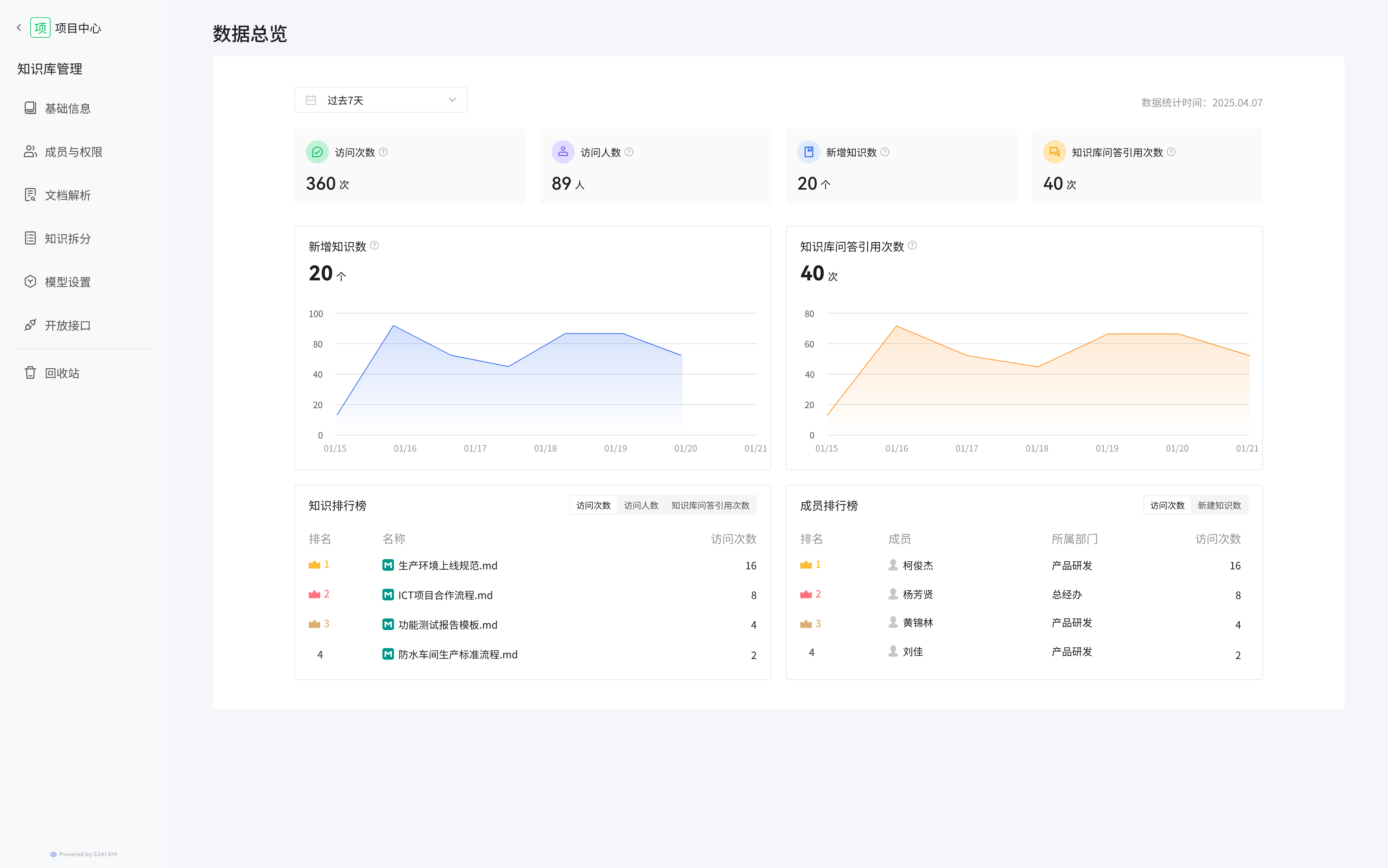 • 成员排行榜:展示成员的访问次数、新增知识数排名,助力了解成员对知识的贡献与参与情况。