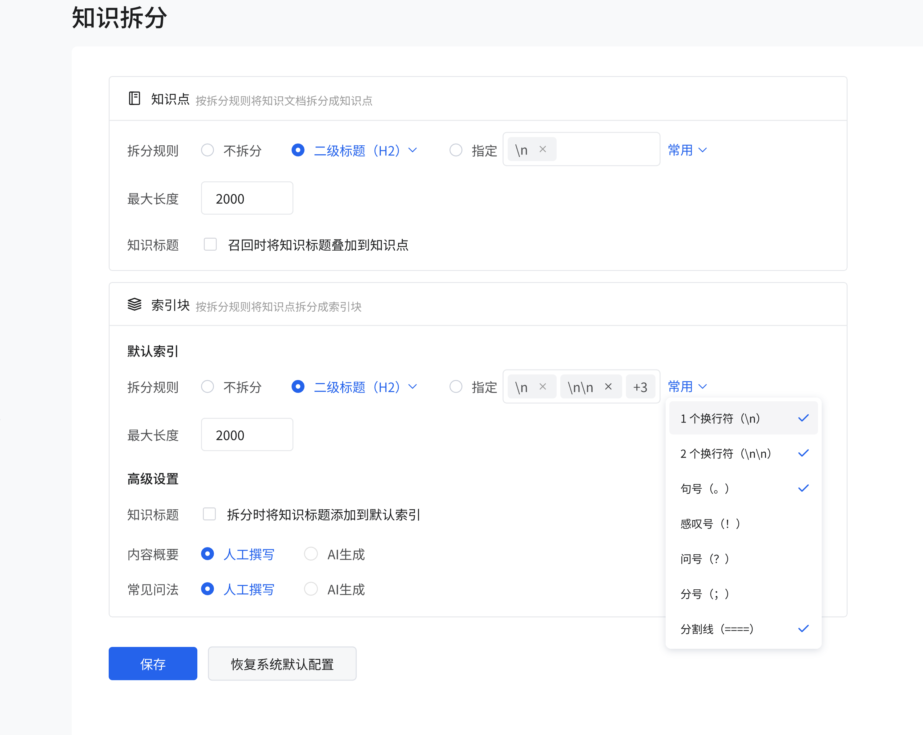 设置默认索引的拆分规则,如 “二级标题(h2)”“指定” 等,设置最大长度(如 2000),在高级设置中,可选择内容摘要(人工撰写或 AI 生成)、常见问法(人工撰写或 AI 生成)的生成方式,还可选择拆分时的分隔符(如 1 个换行符、句号等)。设置完成后,点击 “保存” 按钮保存,或点击 “恢复系统默认配置” 恢复默认设置。 image.png