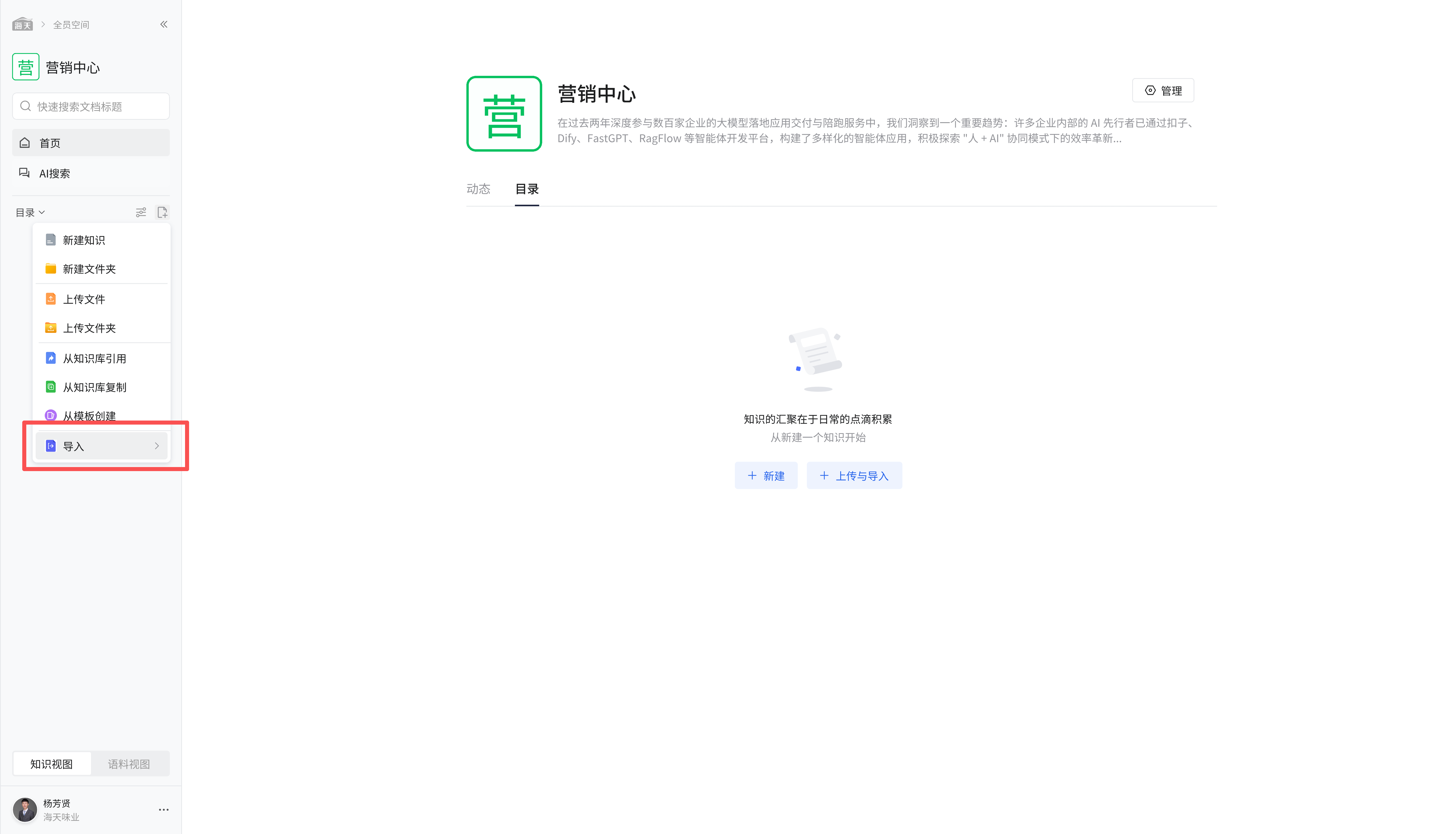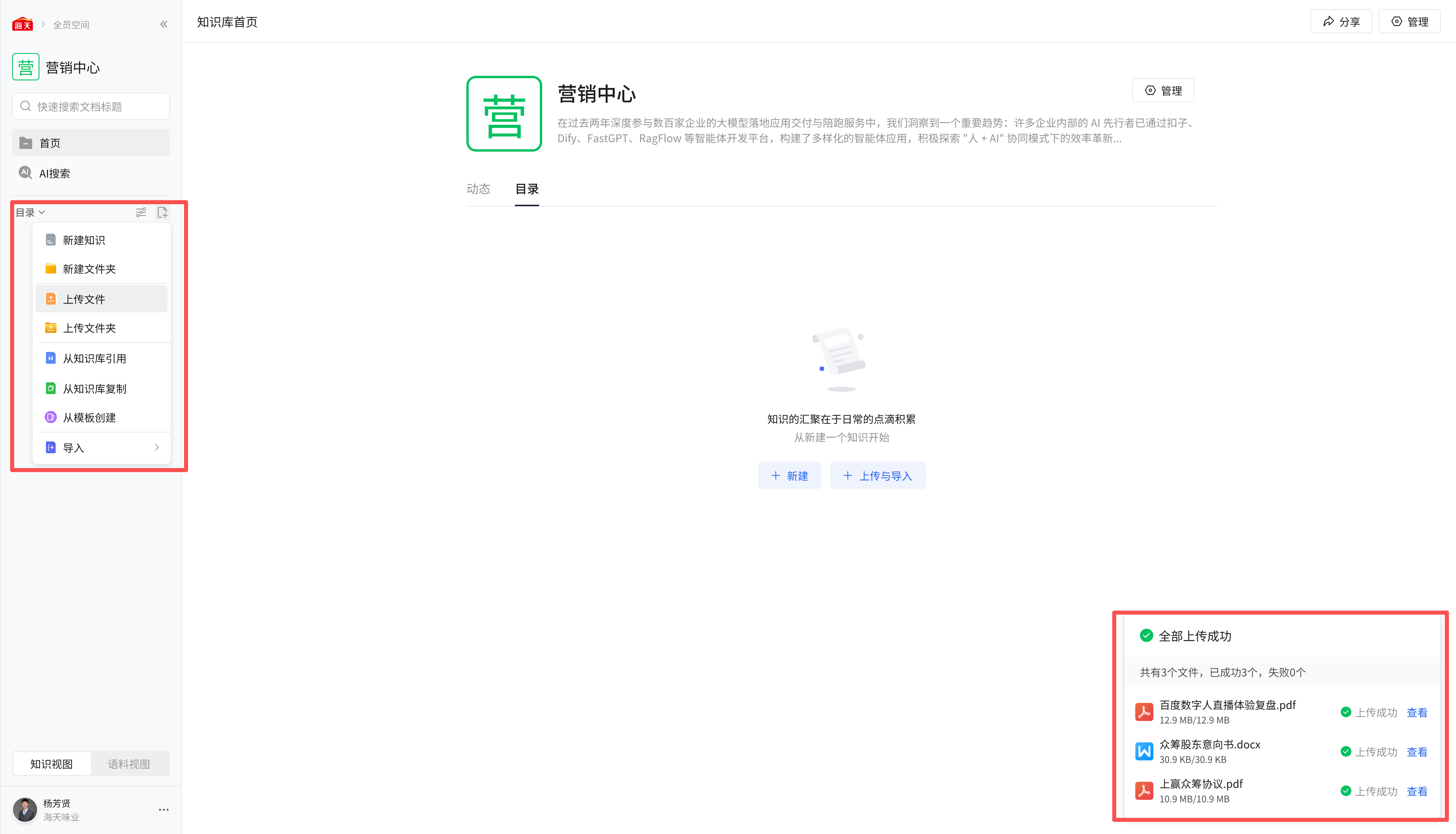 - 1、新建知识:进入目标知识库(如 “营销中心” 知识库),在左侧 “目录” 区域点击 “新建知识”,可创建新的知识文档。