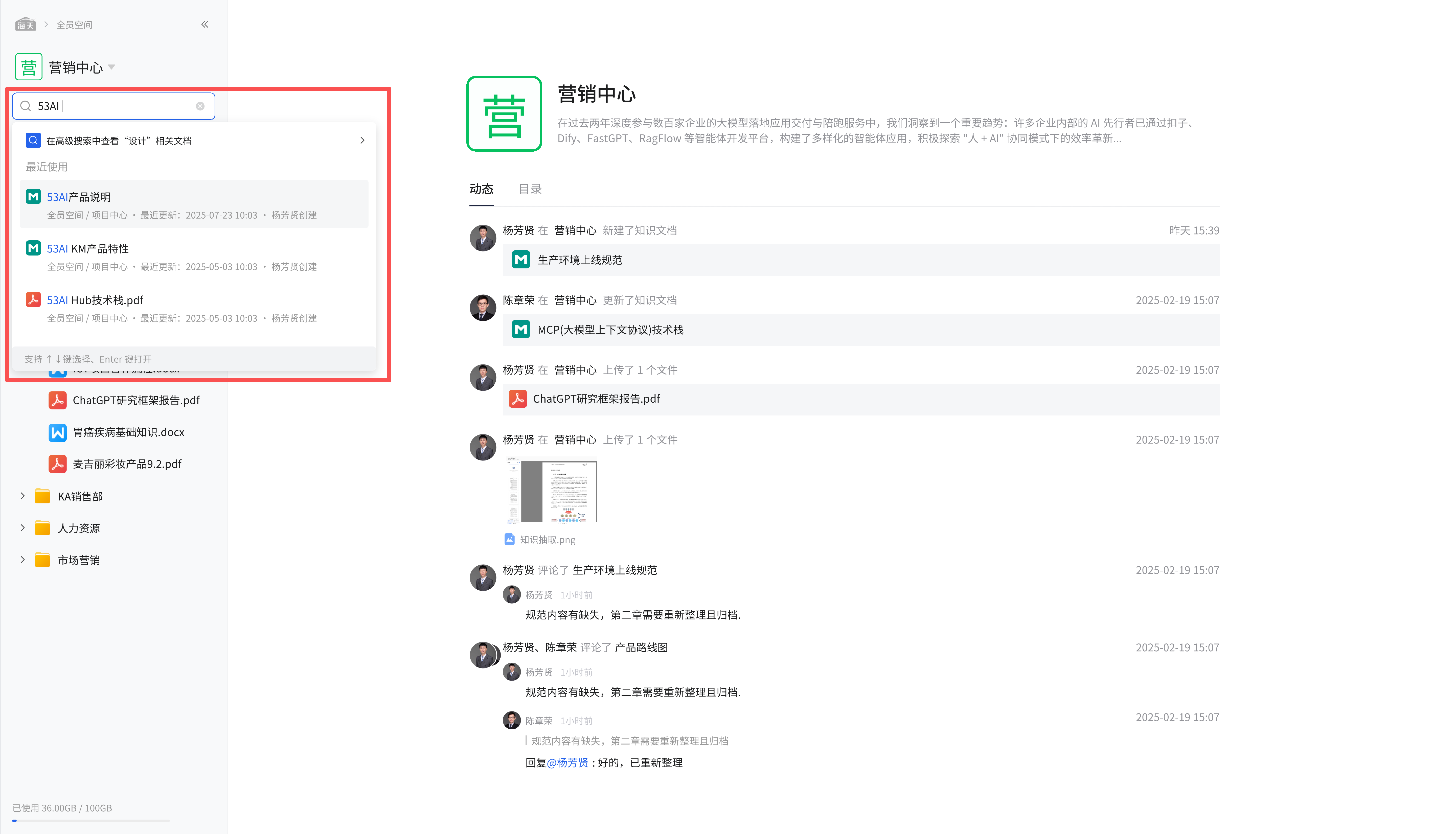 1、知识库全局搜索:在知识库(如 “营销中心” 知识库)左侧或页面右上角的搜索框中,输入关键词(如 “53AI”),系统会自动匹配相关文档,展示 “最近使用” 的相关文档列表,支持通过 “↑↓” 键选择、“Enter” 键打开文档,也可点击 “在高级搜索中查看更多” 查看更全面的搜索结果,快速定位所需知识。