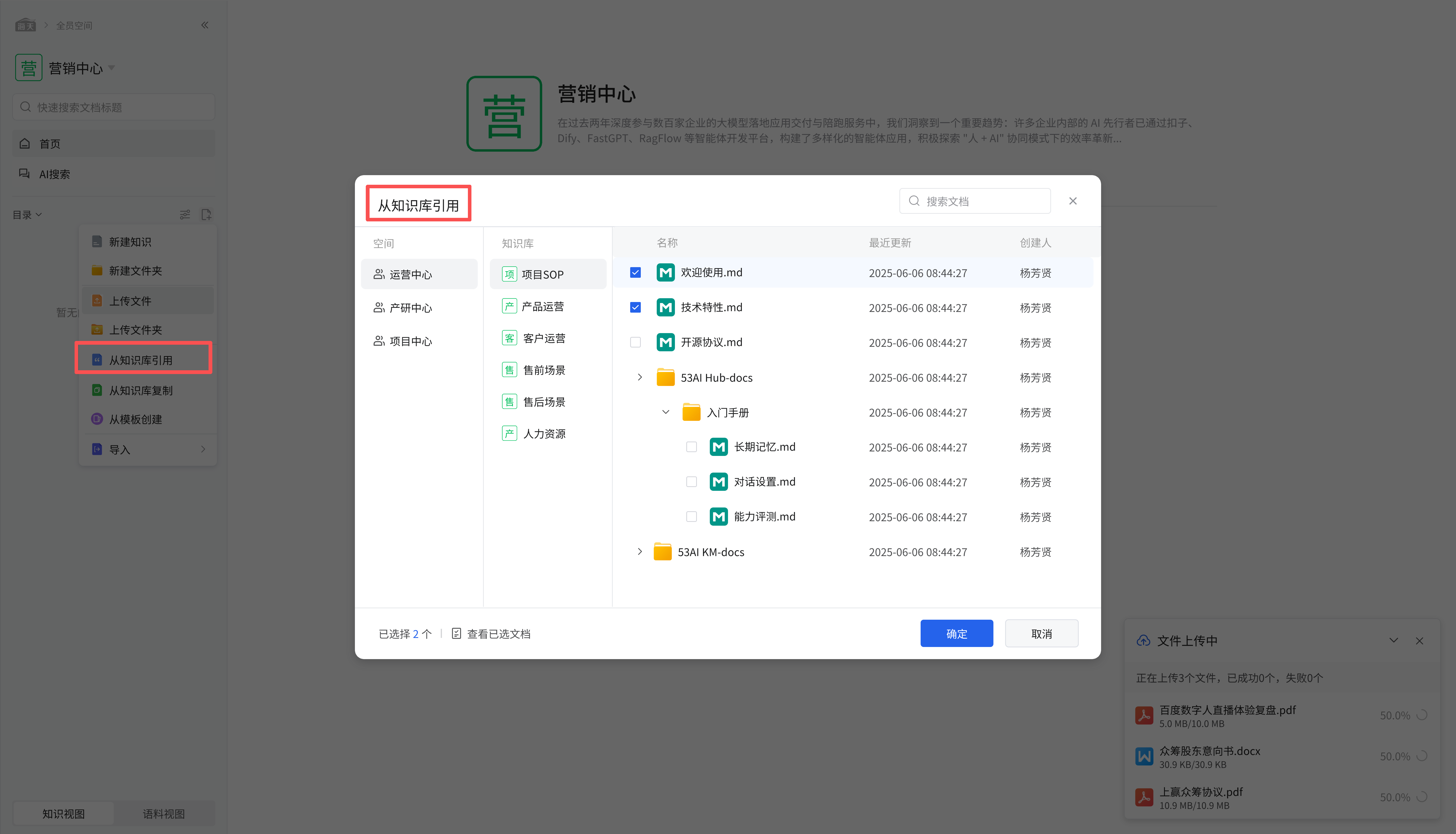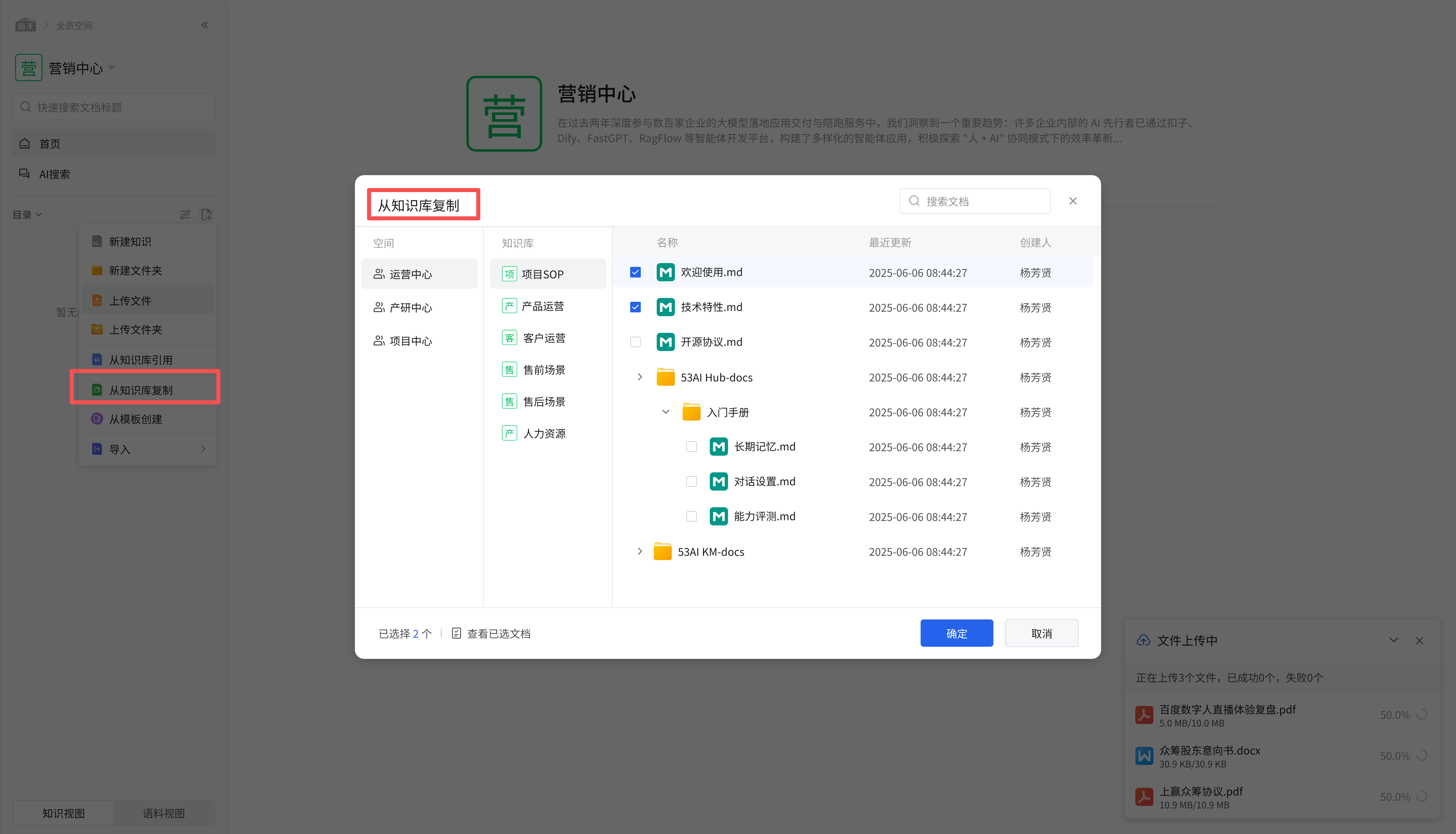 点击 “从知识库复制”,在弹出的 “从知识库复制” 弹窗中,选择目标空间(如 “运营中心”)、目标知识库(如 “项目 SOP”),勾选要复制的文档(可多选),点击 “确定”,即可将所选文档复制到当前知识库。