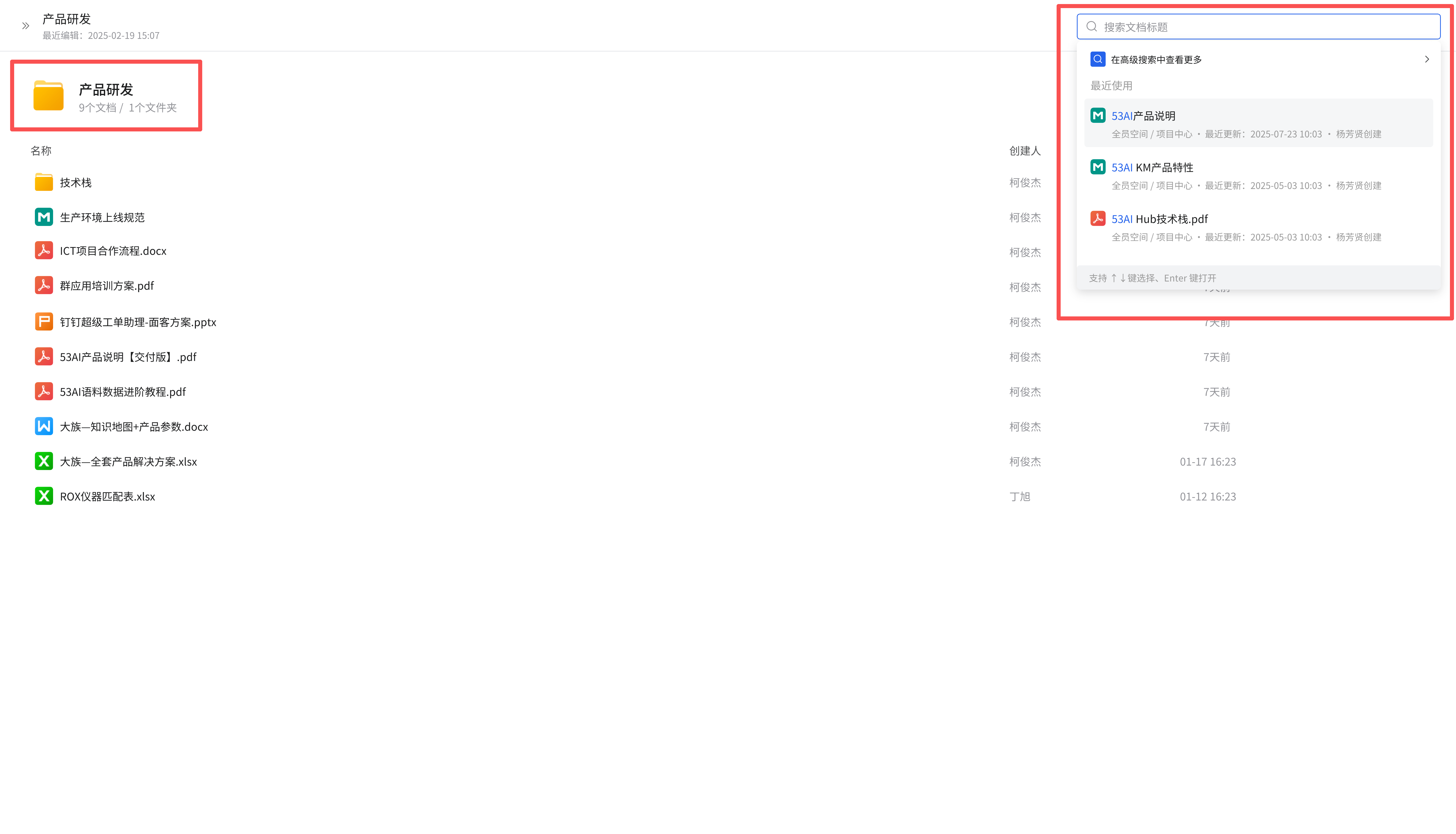 2、文件夹内搜索:进入具体文件夹(如 “产品研发” 文件夹),在文件夹页面右上角的搜索框中输入关键词,可在该文件夹范围内搜索文档标题,系统会展示匹配的文档结果,方便在文件夹内快速查找特定知识。