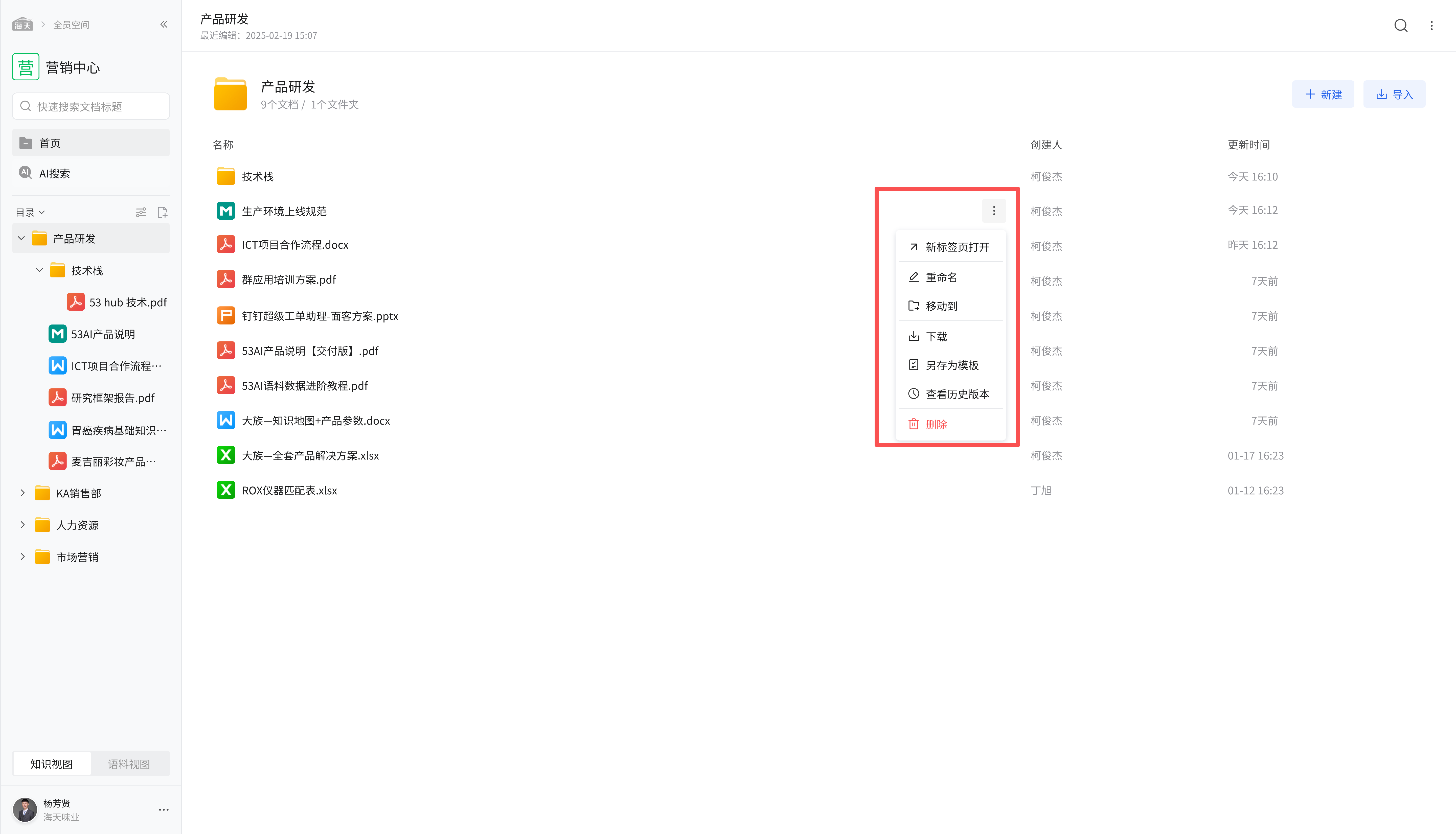 2、对于知识库内的文件(如 “生产环境上线规范” 文档),点击右侧的更多操作按钮,可进行 “新标签页打开”“重命名”“移动到”“下载”“另存为模板”“查看历史版本”“删除” 等操作,满足对知识的不同管理需求。