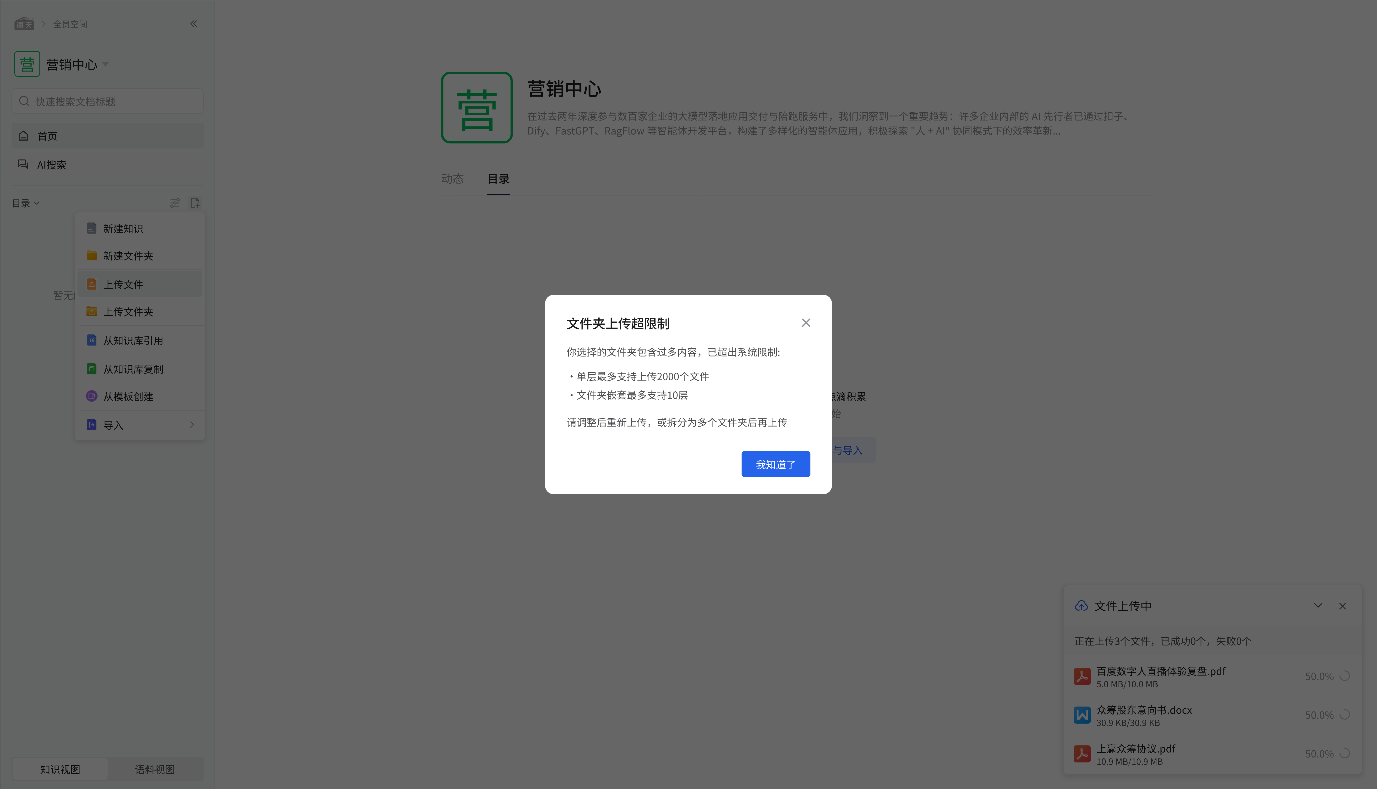 2、文件夹上传限制:若选择上传的文件夹包含过多内容,超出系统限制(单层最多支持上传 2000 个文件、文件夹嵌套最多支持 10 层),会弹出 “文件夹上传超限制” 提示框,提示调整后重新上传或拆分为多个文件夹后再上传,点击 “我知道了” 关闭提示框。