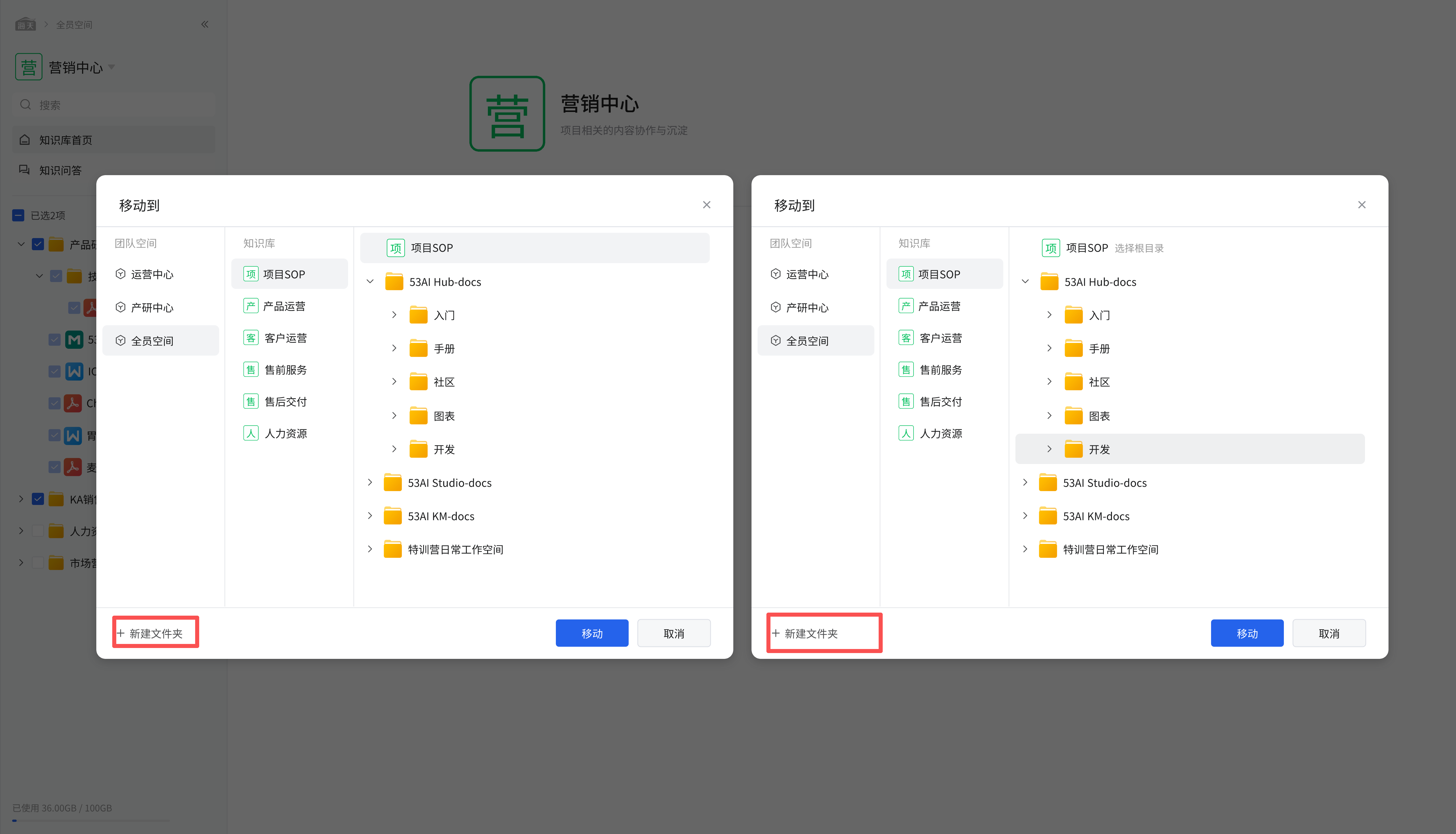 2、知识移动:选中要移动的知识(文件或文件夹),点击右侧的更多操作按钮,选择 “移动到”。在弹出的 “移动到” 弹窗中,选择目标团队空间(如 “全员空间”)、目标知识库(如 “项目 SOP”)及具体的目录位置,也可点击 “+ 新建文件夹” 创建新文件夹作为目标位置,选择完成后点击 “移动” 按钮,即可将知识移动到指定位置。