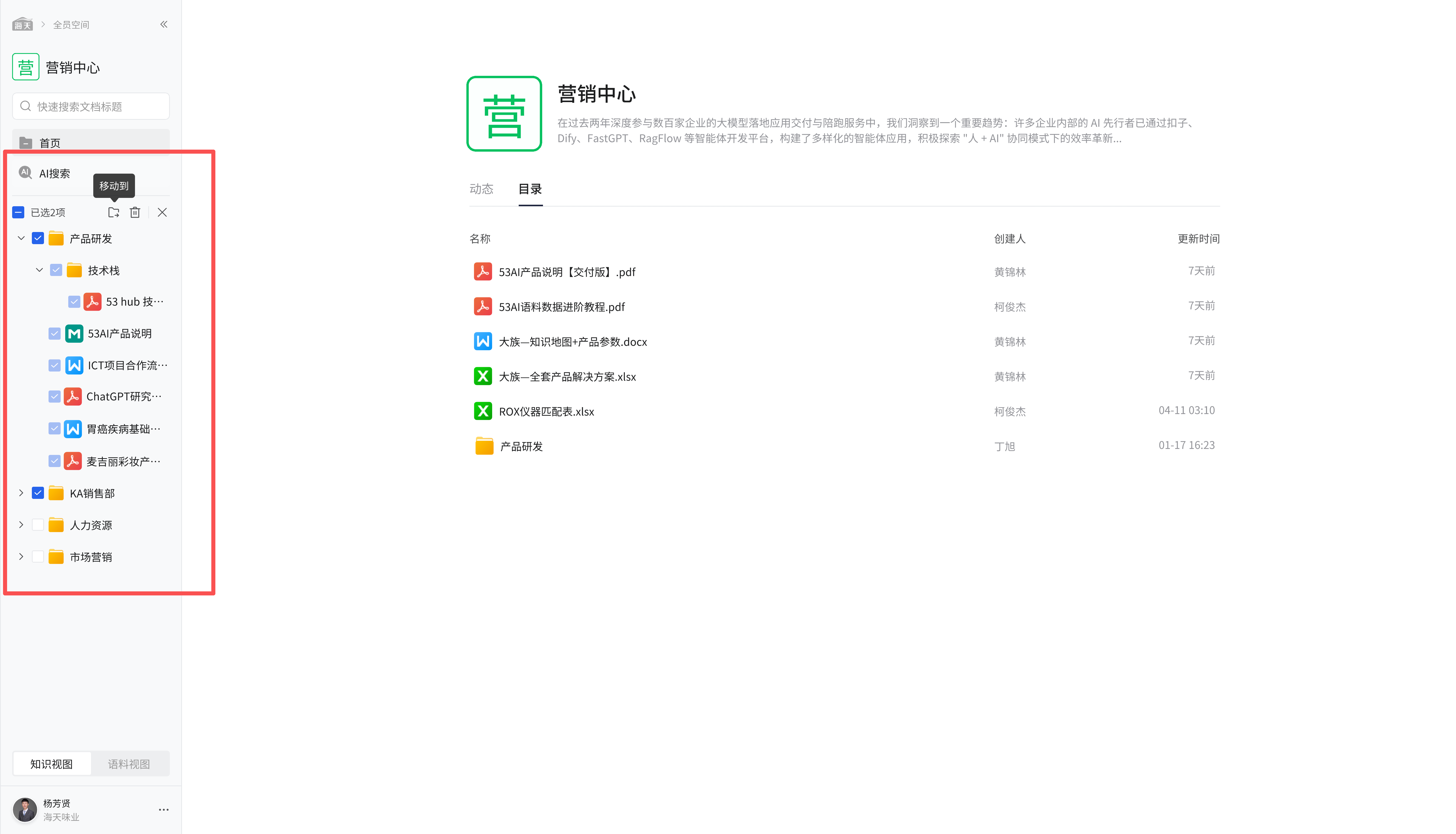 - 1、进入具体文件夹(如 “产品研发” 文件夹),可查看该文件夹内的所有文档列表,包括文档名称、创建人、更新时间等信息,同时也可对文件夹内的文档进行下述各类操作。