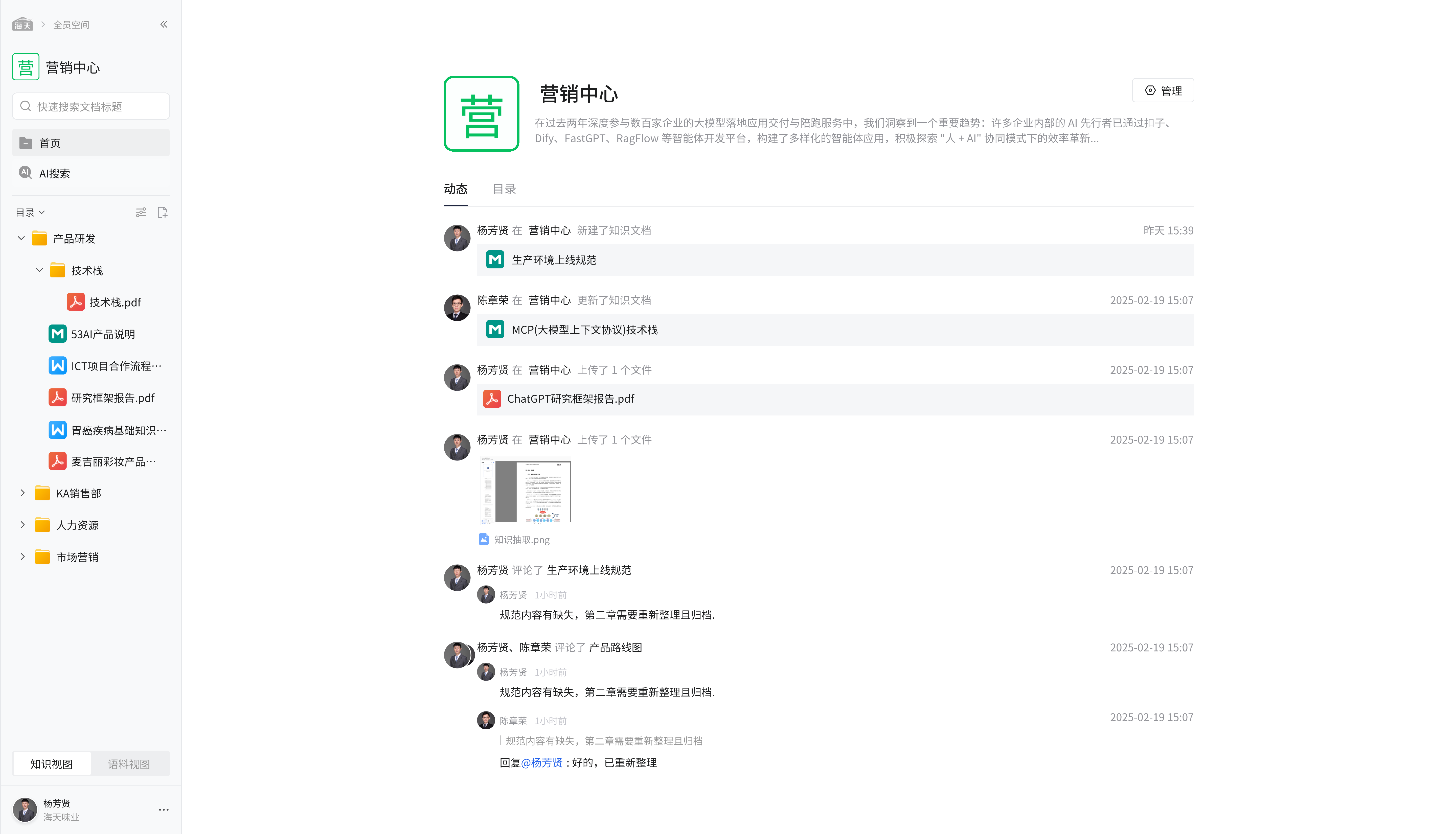 在知识库页面,点击 “动态” 标签,可查看知识库内的动态信息,包括知识文档的新建、更新、文件上传、评论等操作记录,每条记录会显示操作人、操作内容及时间,方便团队成员了解知识的最新变化与协作情况。