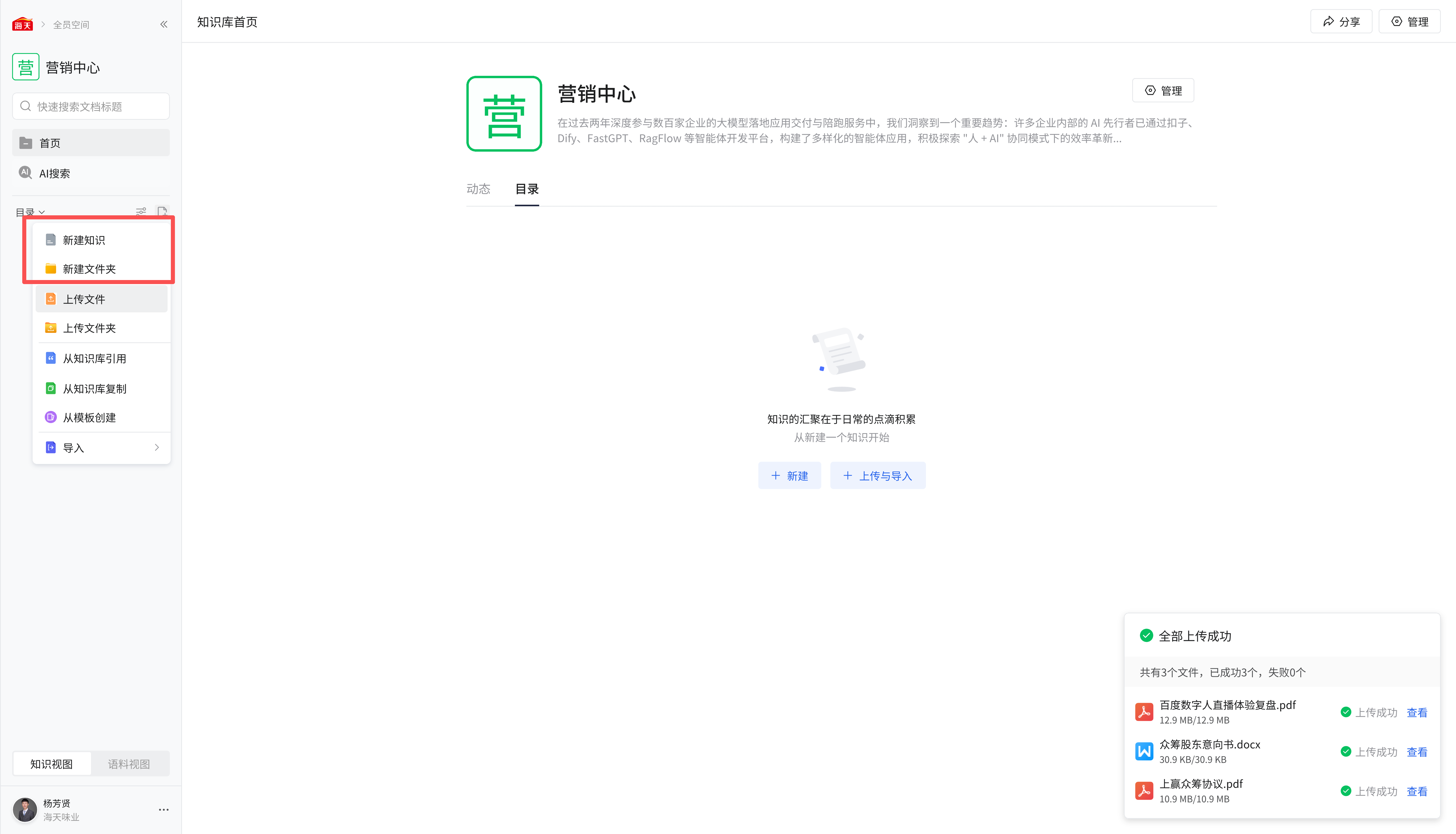 1、单文件 / 多文件上传:进入目标知识库,在左侧 “目录” 区域展开操作选项,点击 “上传文件”,选择要上传的文件(可批量选择多个文件),系统会显示上传进度。上传完成后,在右下角会提示 “全部上传成功”,并列出已上传的文件及相关信息(如文件名、大小、上传状态等),点击 “查看” 可查看文件详情。