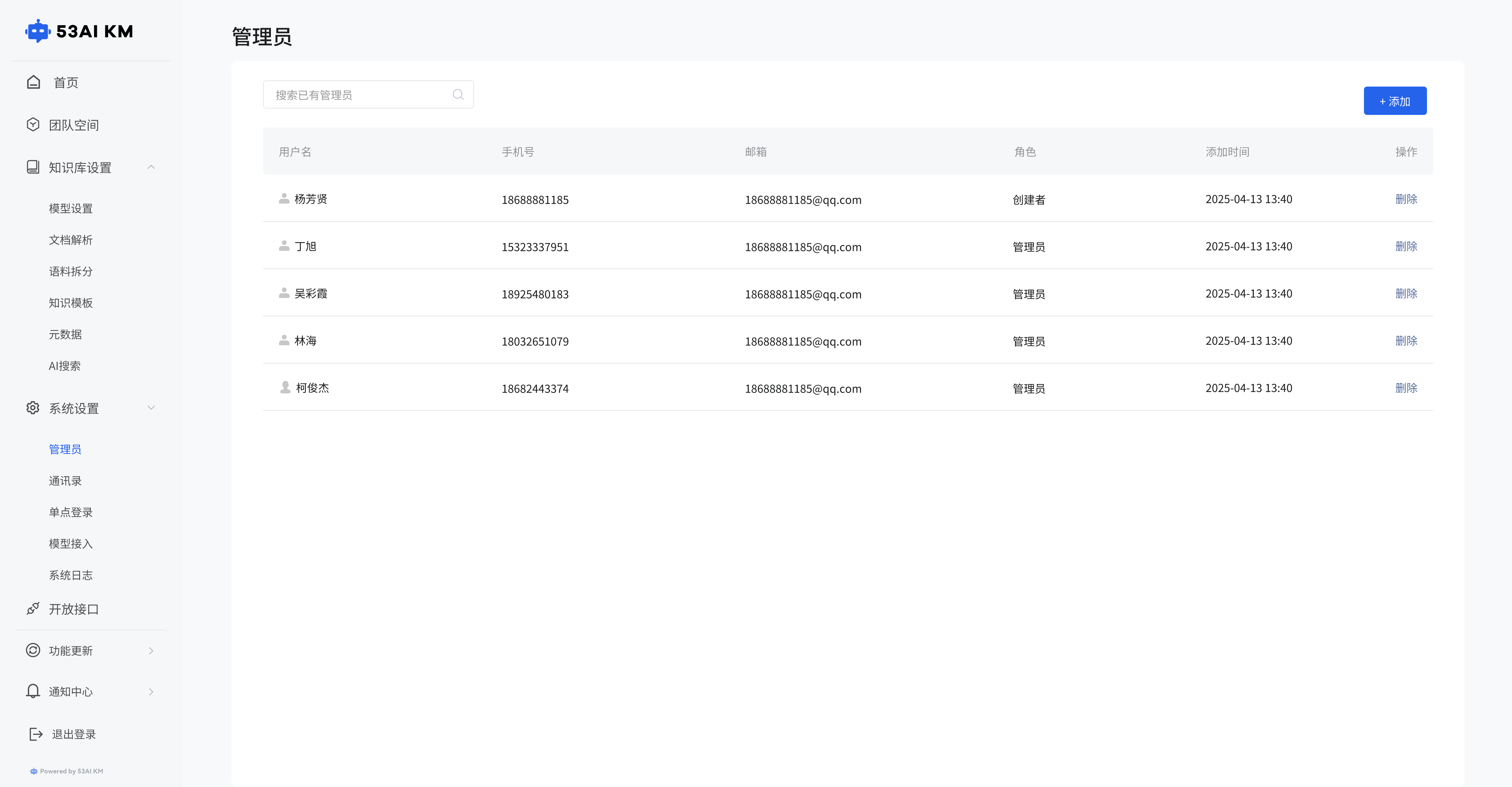 进入 53AI KM 系统后,点击左侧导航栏中 “系统设置” 下的 “管理员” 选项,即可查看管理员列表,列表展示了管理员的用户名、手机号、邮箱、角色以及添加时间等信息。 c8b5d9dcbf9ee27f5e4dd8c0db610a80.png