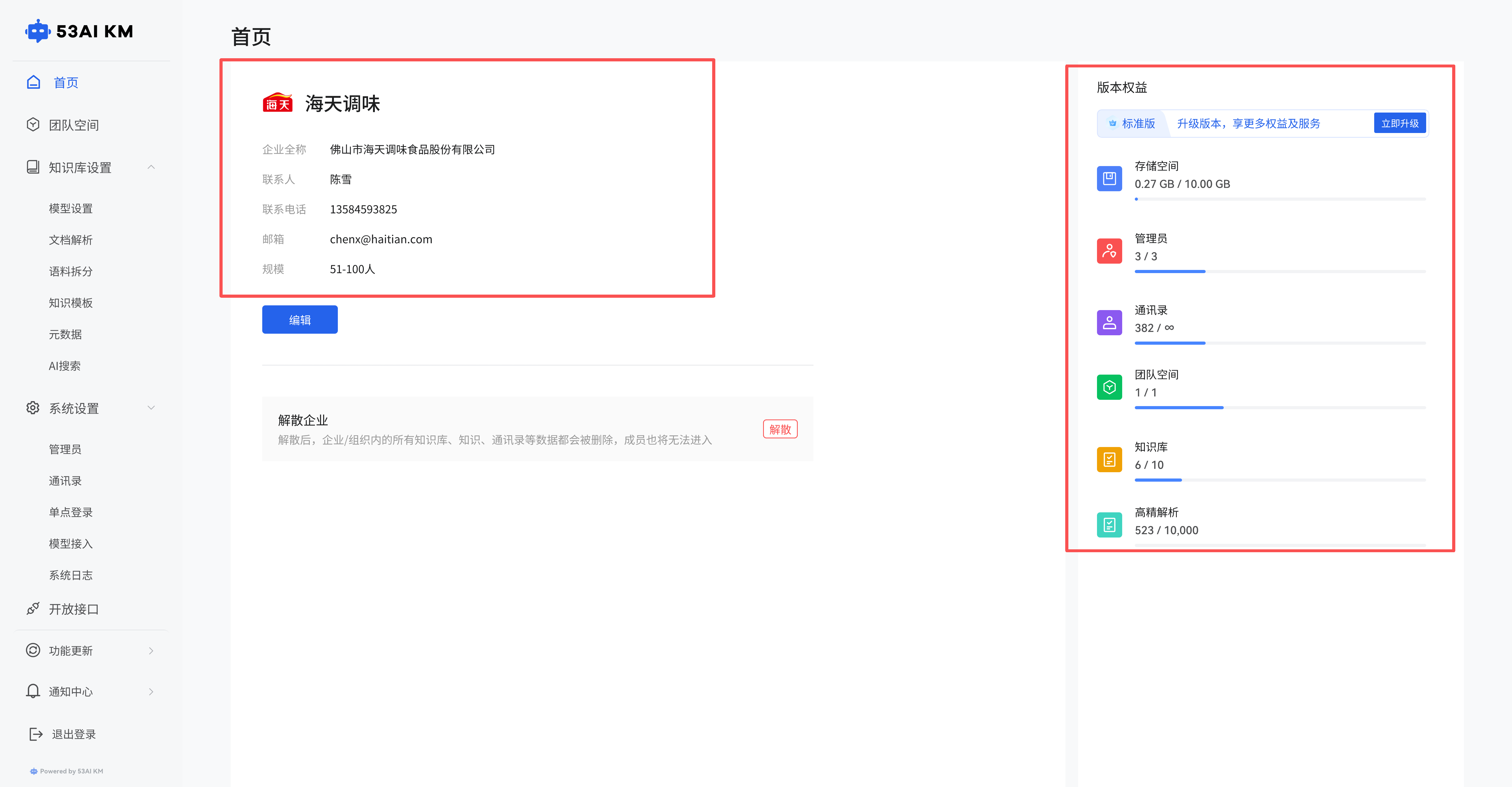 进入 53AI KM 首页,可直接查看企业全称、联系人、联系电话、邮箱、规模等企业基本信息,同时在页面右侧能查看版本权益相关内容,如存储空间使用情况、管理员数量、通讯录人数、团队空间数量、知识库数量、高精解析次数等。 7c813de5238ba5def32389489a3b27fd.png